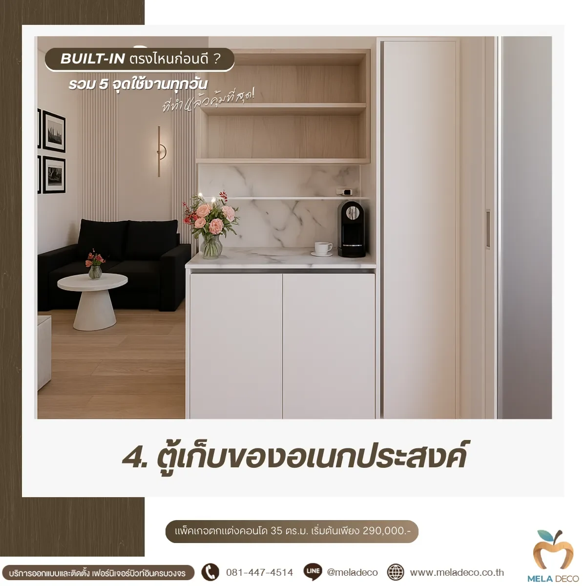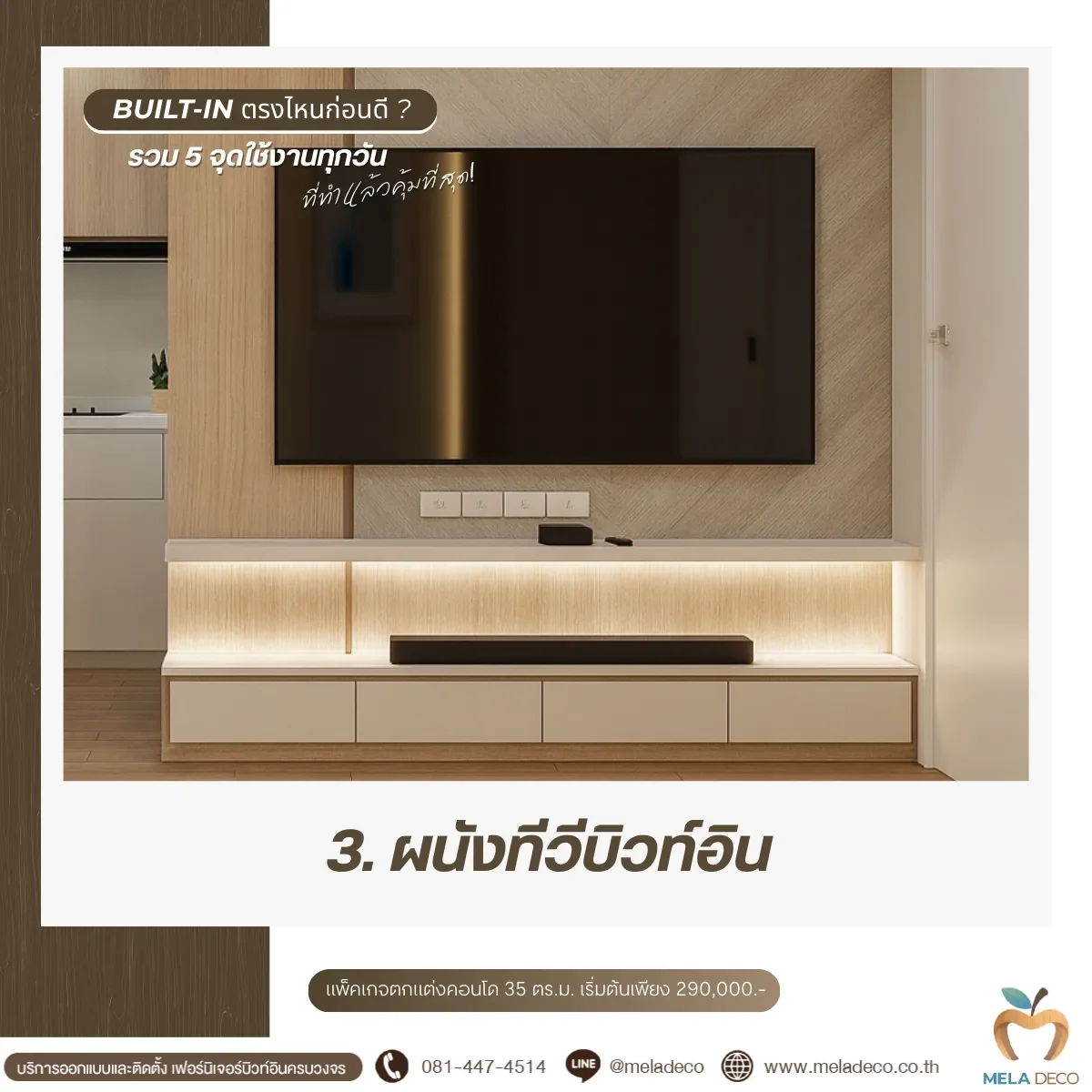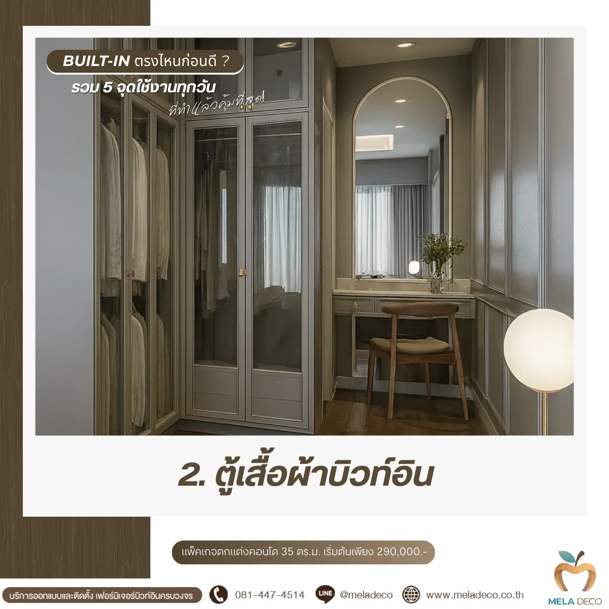 การบิ้วอินไม่จำเป็นต้องทำทุกจุดพร้อมกัน แต่ควรเริ่มจากพื้นที่ที่ใช้งานจริงทุกวันก่อนค่ะ ไม่ว่าจะเป็นครัว ตู้เสื้อผ้า ผนังทีวี ตู้เก็บของ หรือมุมทำงาน การวางแผนบิ้วอินอย่างเป็นระบบ จะช่วยให้บ้านน่าอยู่ ใช้งานสะดวก และลดค่าใช้จ่ายในการแก้ไขภายหลัง หากคุณกำลังมองหาทีมออกแบบและรับทำบิ้วอินที่เข้าใจทั้งฟังก์ชันและความสวยงาม ให้ Mela Deco ช่วยออกแบบงานบิ้วอินให้ตอบโจทย์การใช้งานจริง พร้อมใส่ใจในรายละเอียดและภาพรวมของพื้นที่ เพื่อให้บ้านของคุณสวย ใช้ได้จริง และอยู่สบายในทุกวันค่ะ