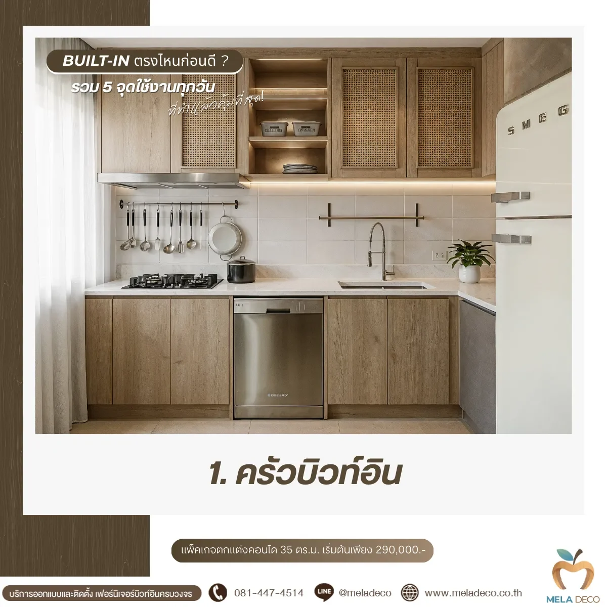 ครัวถือเป็นหนึ่งในพื้นที่ที่ถูกใช้งานมากที่สุด ไม่ว่าจะเป็นบ้านหรือคอนโด เพราะเกี่ยวข้องกับการทำอาหาร การเก็บของ และการใช้งานเครื่องใช้ไฟฟ้าหลากหลายประเภท การเลือกทำครัวบิ้วอินตั้งแต่แรกเพราะช่วยให้การใช้งานเป็นระบบและปลอดภัยมากกว่าเฟอร์นิเจอร์ลอยตัว ข้อดีของการบิ้วอินครัวคือสามารถออกแบบตู้เก็บของให้พอดีกับพื้นที่จริง วางตำแหน่งเตา ซิงก์ล้างจานและตู้เย็นได้เหมาะสม ลดปัญหาน้ำมันกระเด็น ความชื้นสะสม หรือพื้นที่อับที่ทำความสะอาดยาก นอกจากนี้ ยังสามารถเลือกวัสดุที่ทนความร้อนและความชื้นได้ดีกว่า งานบิ้วอินครัวที่ดี ไม่ได้เน้นแค่ความสวยงาม แต่ต้องคำนึงถึงฟังก์ชันการใช้งานจริง เช่น ความสูงของเคาน์เตอร์ การเปิด-ปิดลิ้นชัก ระบบ Soft Close รวมถึงพื้นที่จัดเก็บที่เพียงพอ ซึ่งหากออกแบบโดยทีมมืออาชีพอย่าง Mela Deco จะช่วยวางผังครัวให้เหมาะกับไลฟ์สไตล์ของผู้อยู่อาศัย ทำให้ครัวเป็นพื้นที่ที่ใช้งานสะดวกและอยู่ได้นานโดยไม่ต้องแก้ไขภายหลังเลยค่ะ