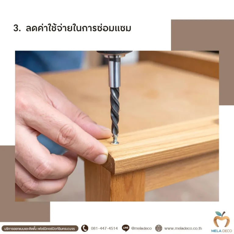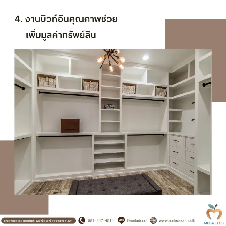 งานบิวท์อินที่ไม่ได้มาตรฐานอาจติดตั้งไม่แน่น พื้นไม้บวม หรือเกิดช่องว่างระหว่างผนัง ซึ่งในระยะยาวอาจต้องรื้อทำใหม่ทั้งชุด ซึ่งเสียทั้งเงินและเวลาในทางกลับกัน การติดตั้งอย่างถูกวิธีโดยทีมช่างมืออาชีพจะช่วยยืดอายุการใช้งานและป้องกันปัญหาในอนาคตได้ เช่น เดินระบบไฟซ่อนอย่างปลอดภัยและเป็นระเบียบ โดย Mela Deco ให้ความสำคัญกับทุกขั้นตอนของการติดตั้ง