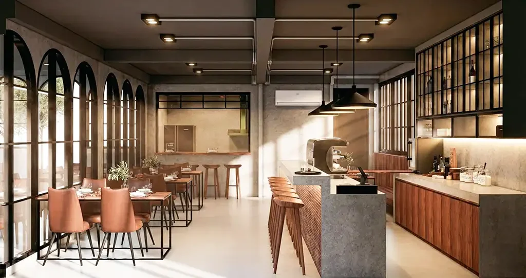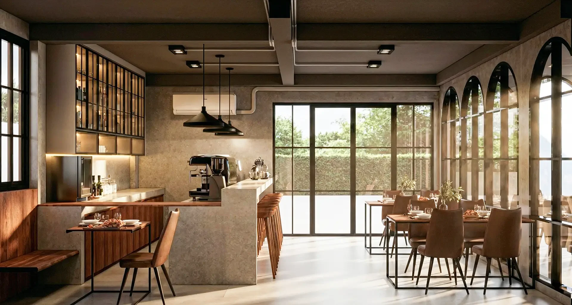 เราสร้างสรรค์บรรยากาศที่ ‘หนักแน่น’ แต่ ‘มีรสนิยม’ ผ่านการคุมโทนสี Dark Oak & Charcoal ผสานกับ Texture ที่จริงใจอย่างอิฐแดงและเหล็กเปลือย พื้นที่แห่งนี้ไม่ได้เป็นเพียงร้านกาแฟ แต่เป็น ‘Social Hub’ ที่มอบพลังงานความคึกคัก น่าค้นหา และแฝงไปด้วยความหรูหราแบบผู้ใหญ่ (Masculine Luxury) ที่สามารถ Day-to-Night จาก Café สู่ Bar ได้อย่างไร้รอยต่อ