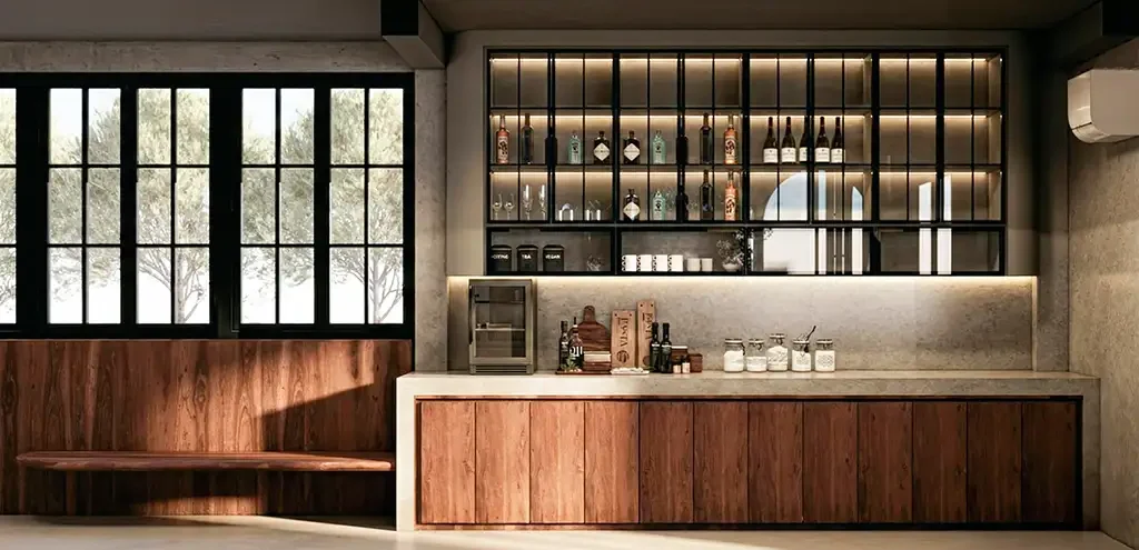 3. The Glow of Nightlife: Ambient Shelving ยกระดับการโชว์วัตถุดิบ ชั้นวางดีไซน์ Custom Steel Shelving พร้อมหน้าบานกระจกและไฟ LED ซ่อนภายใน (Built-in Lighting) เปลี่ยนขวดเครื่องดื่มและเมล็ดกาแฟให้กลายเป็นของตกแต่งที่ทรงคุณค่า สร้าง Mood & Tone ที่ดูแพงและน่าหลงใหล โดยเฉพาะในช่วงเวลา Evening Hours