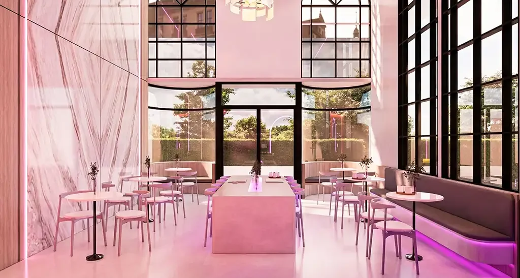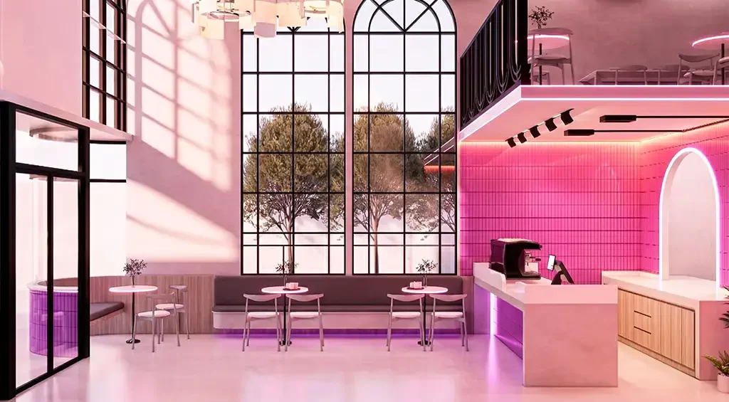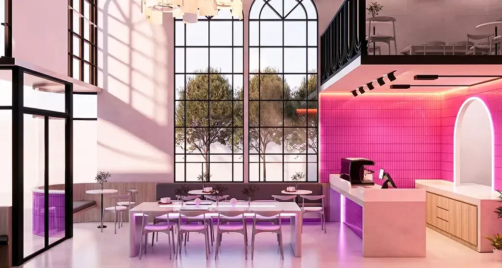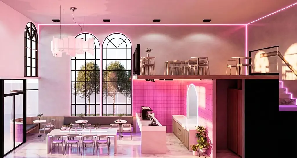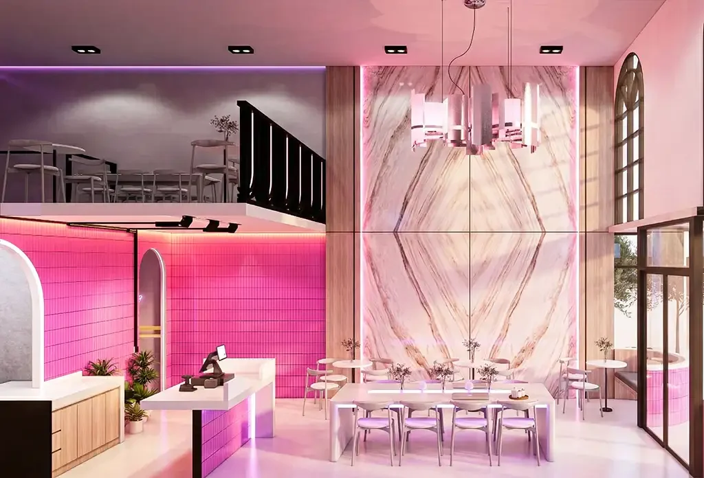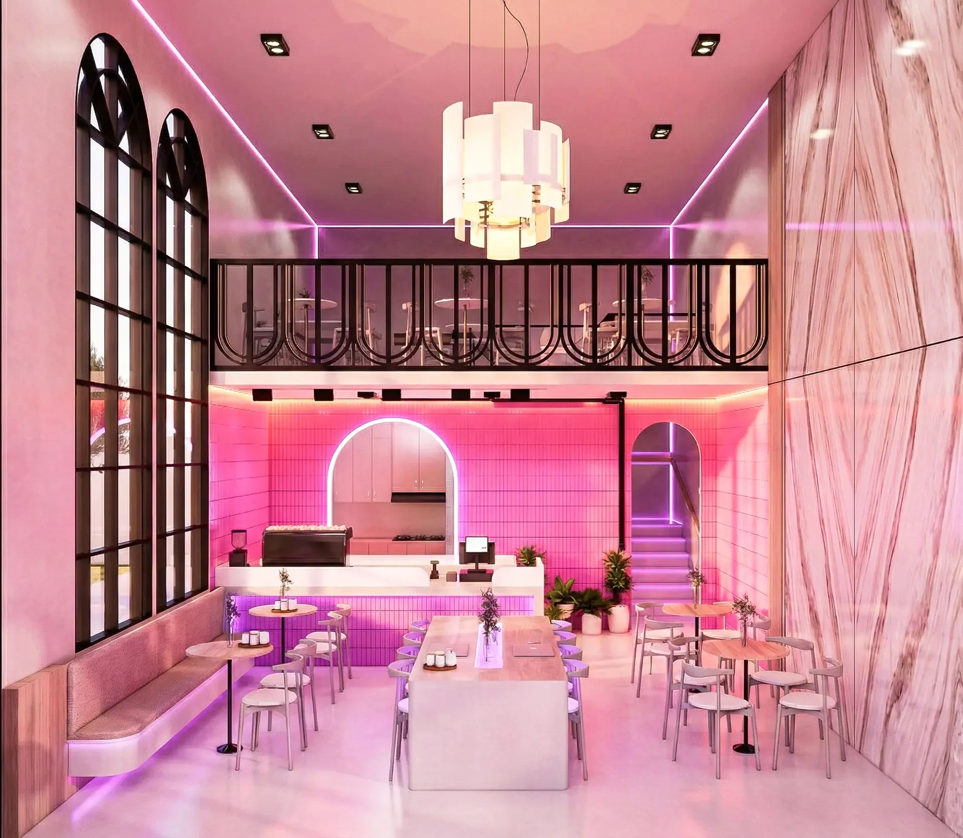 เรานำเสนอความขัดแย้งที่น่าหลงใหล ระหว่างความดิบด้านของ Industrial Concrete กับความเปรี้ยวซ่าของ Neon Pink & Glossy Tiles สร้างเป็นพื้นที่ที่เปี่ยมไปด้วย ‘Energy’ พร้อมเปลี่ยนสถานะจาก Café สุดชิคในตอนกลางวัน ให้กลายเป็น Social Hangout สุดคูลในยามค่ำคืน รองรับไลฟ์สไตล์ Gen Z ที่มองหาความแปลกใหม่และมุมถ่ายรูปที่ ‘ตะโกน’ ความเป็นตัวตนออกมา
