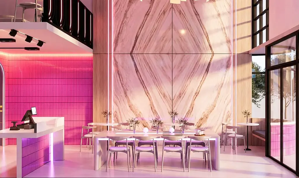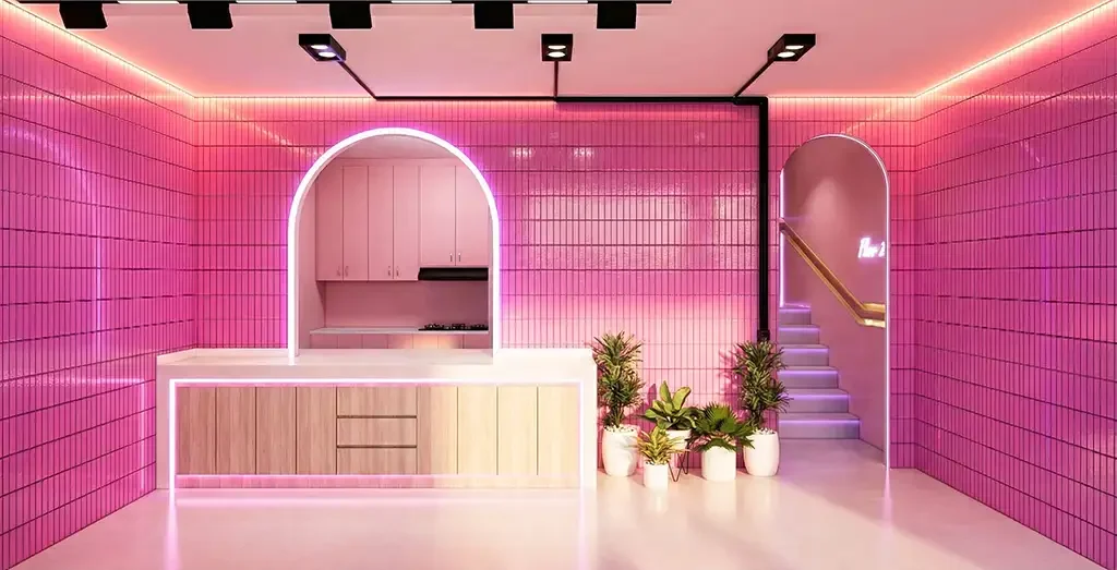 1. The Pop Statement: Glossy Pink & Neon Grid จุดเช็คอินที่ใครเห็นเป็นต้องหยุดมอง… ผนังและเคาน์เตอร์บาร์กรุด้วย ‘Glossy Pink Tiles’ (กระเบื้องกลอสสีชมพูสด) ปูในแพทเทิร์นตาราง Grid ให้ฟีล Retro-Futuristic ผสานกับไฟนีออนเส้นสายเฉียบคมที่ซ่อนอยู่ตามหลืบ สร้างมิติแสงสีชมพูอมม่วงที่ดูทันสมัย ขับเน้นความสนุกให้พื้นที่ดูไม่จำเจ