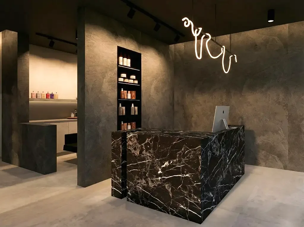 1. The Statement Piece: Majestic Black Marble จุดสายตาแรกที่สะกดทุกความรู้สึก คือเคาน์เตอร์ Black Marble ลายเส้นสีขาวธรรมชาติ ตัดกับความด้านของผนังปูนเปลือยโทนเข้ม สร้างความรู้สึกหนักแน่น มั่นคง และหรูหราแบบไม่ต้องพยายาม นี่คือ First Impression ที่บอกลูกค้าทันทีว่าสถานที่นี้ ‘ไม่ธรรมดา’