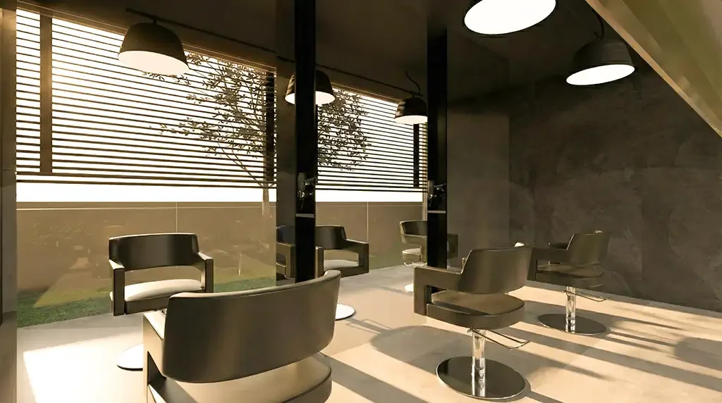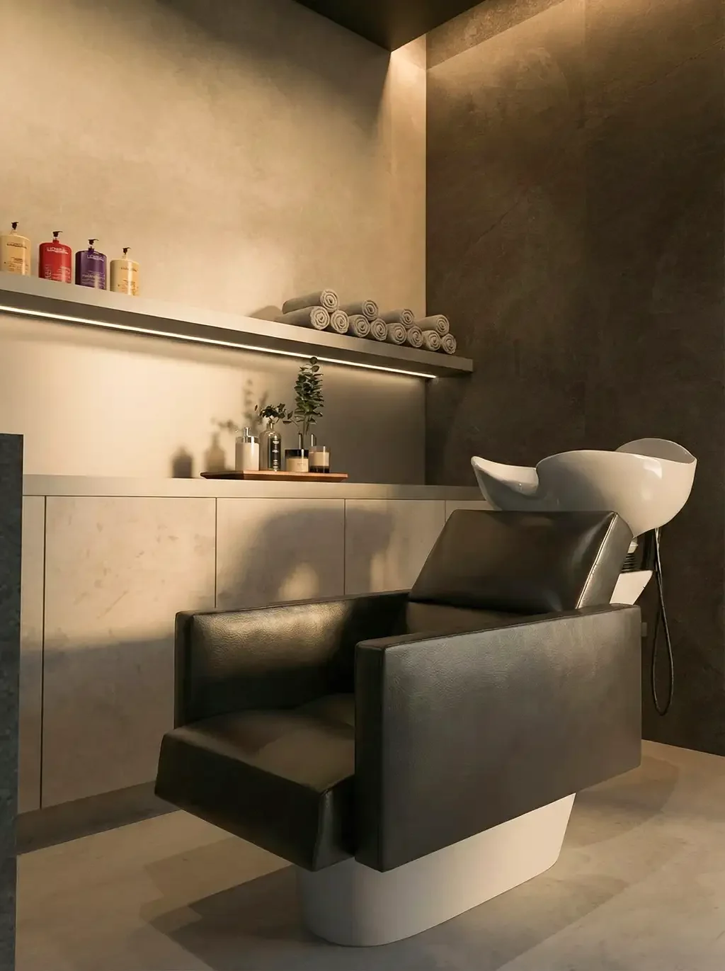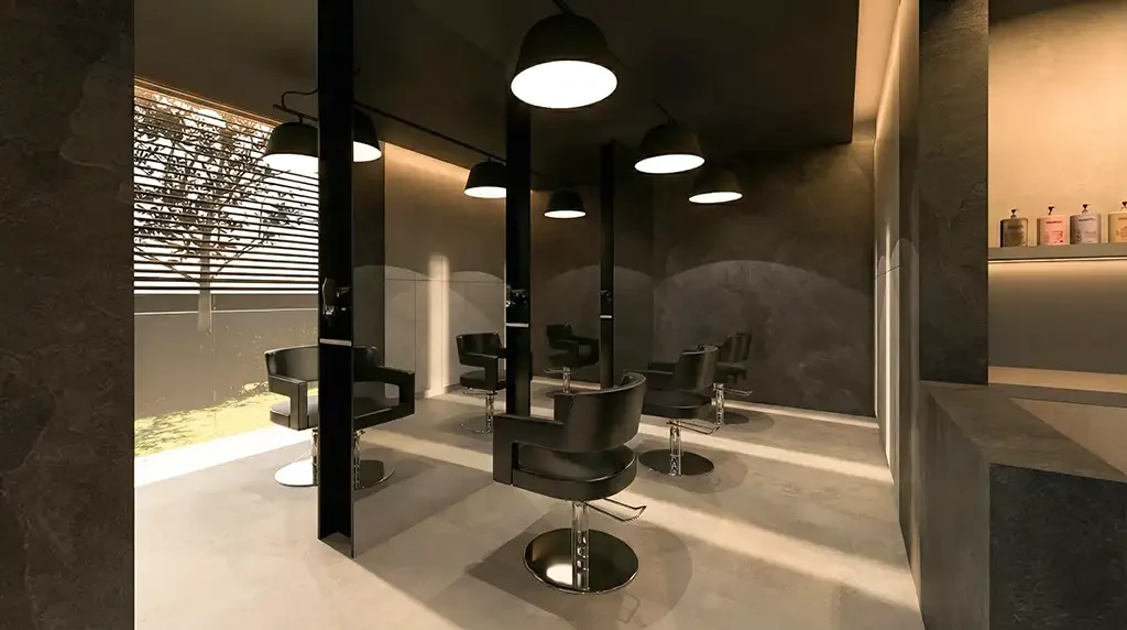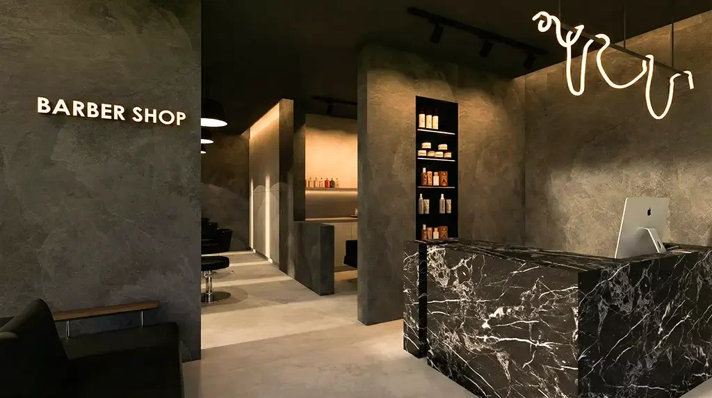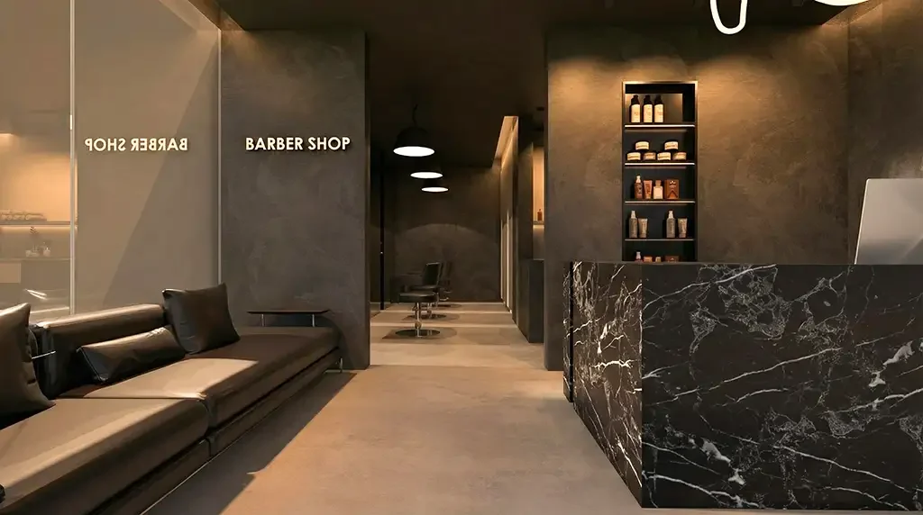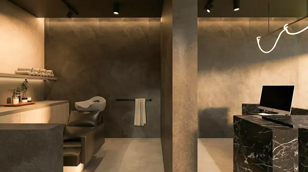 3. Textural Contrast: Raw vs Refined ความเหนือชั้นของการออกแบบคือการเล่นกับ Texture ผนัง Dark Loft Microcement ที่มีความดิบด้าน ตัดสัมผัสกับความเงาและนุ่มนวลของ Premium Black Leather Furniture โซฟายาวและเก้าอี้ตัดผมรูปทรงเรขาคณิต ให้ความรู้สึกเหมือนนั่งอยู่ใน Lounge ของโรงแรม 5 ดาว มากกว่าร้านตัดผมทั่วไป