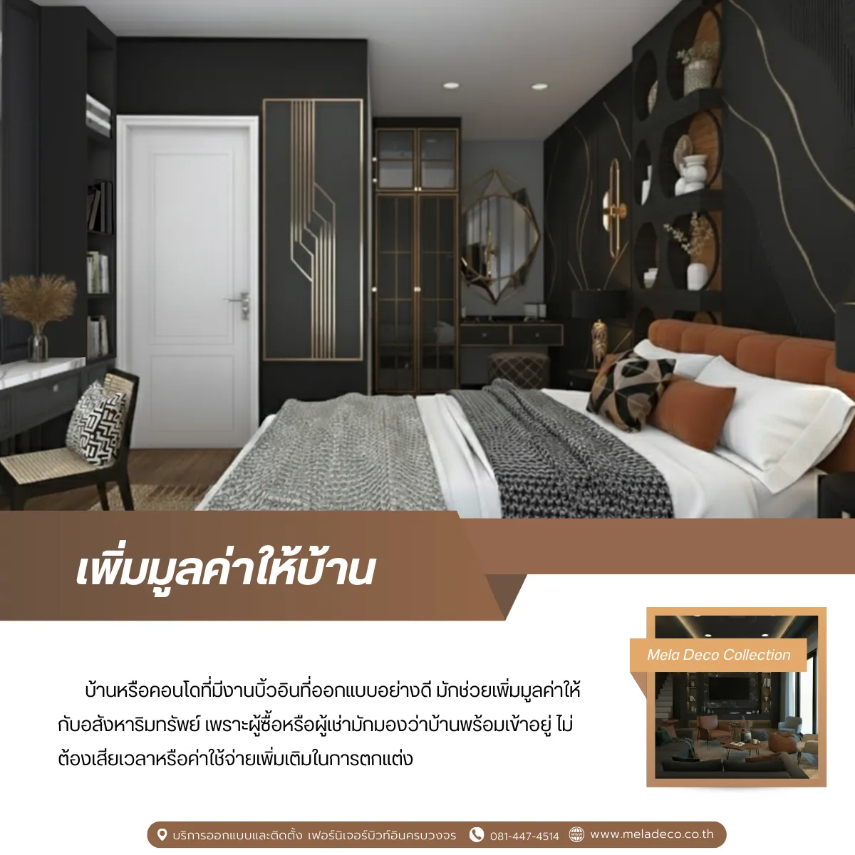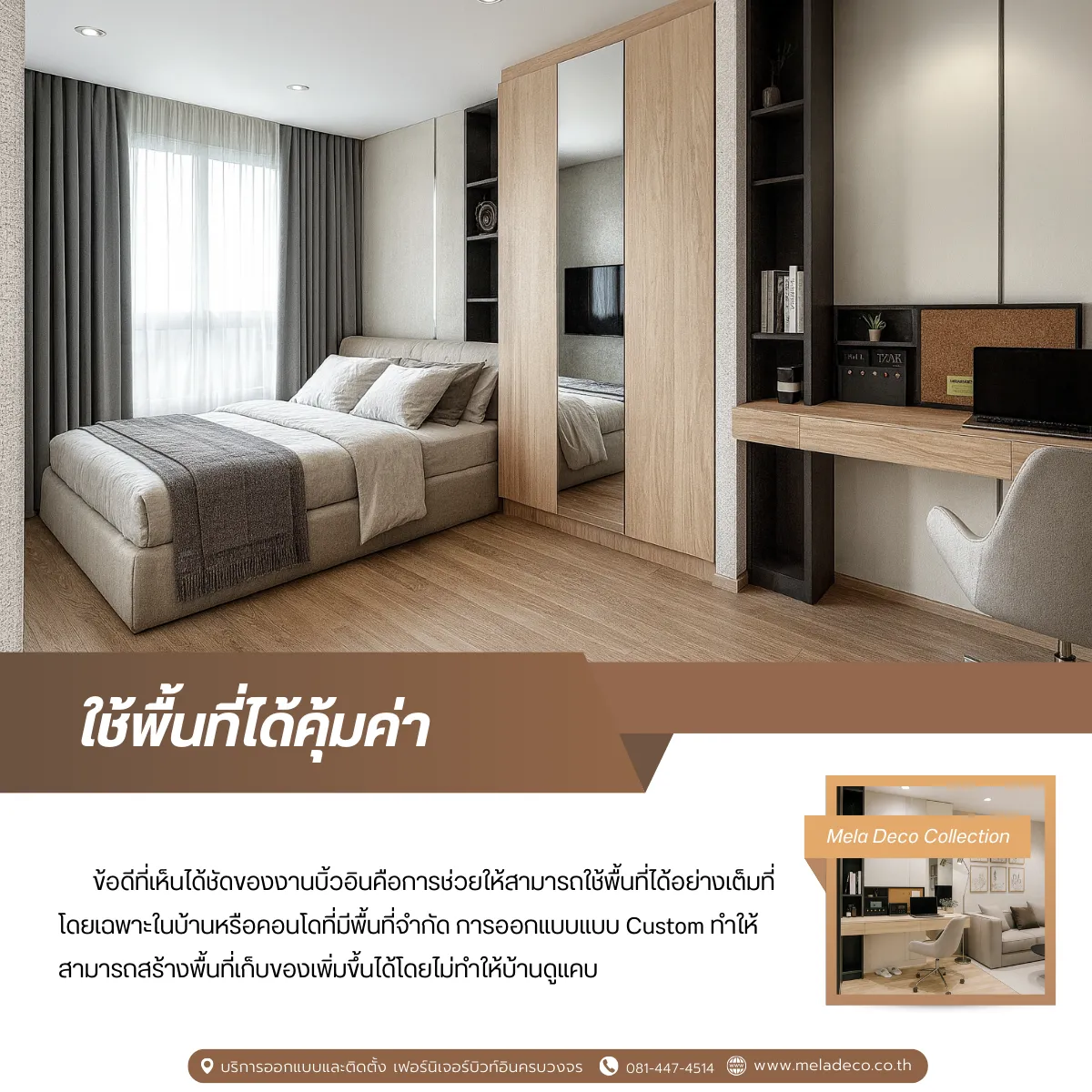 การทำบิ้วอินไม่ใช่แค่การตกแต่งบ้านให้สวยแต่คือการออกแบบพื้นที่ให้ตอบโจทย์การใช้ชีวิตจริง ช่วยให้บ้านดูเป็นระเบียบ ใช้งานสะดวก และช่วยเพิ่มมูลค่าให้กับอสังหาริมทรัพย์ในระยะยาว หากคุณกำลังมองหางานบิ้วอินที่ออกแบบเฉพาะตัวและต้องการทีมงานที่เข้าใจทั้งดีไซน์และการใช้งานจริง Mela Deco พร้อมดูแลคุณนะคะ ทีมงานของเราพร้อมช่วยเปลี่ยนบ้านให้กลายเป็นพื้นที่ที่สะท้อนตัวตนและไลฟ์สไตล์ของคุณได้อย่างแท้จริงค่ะ