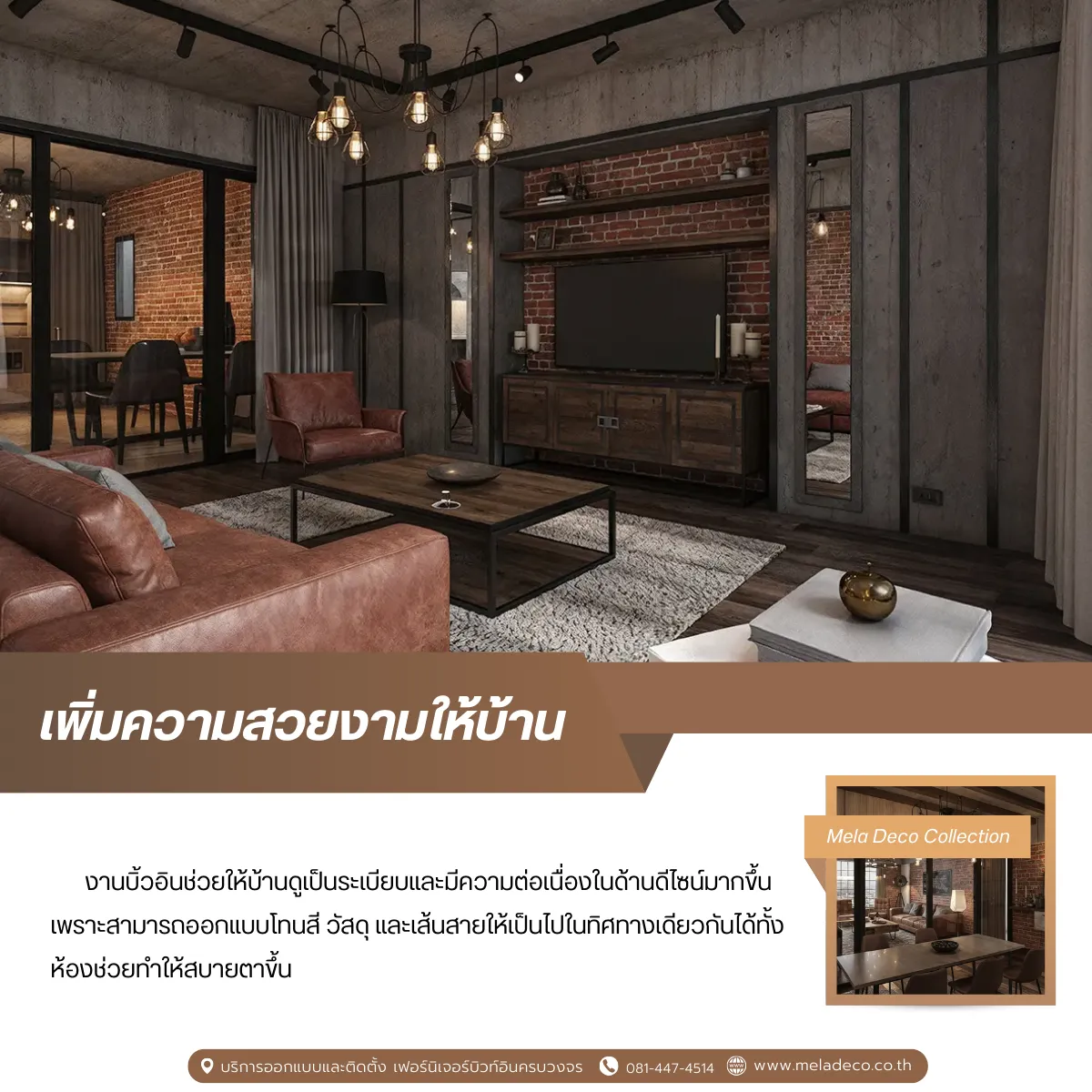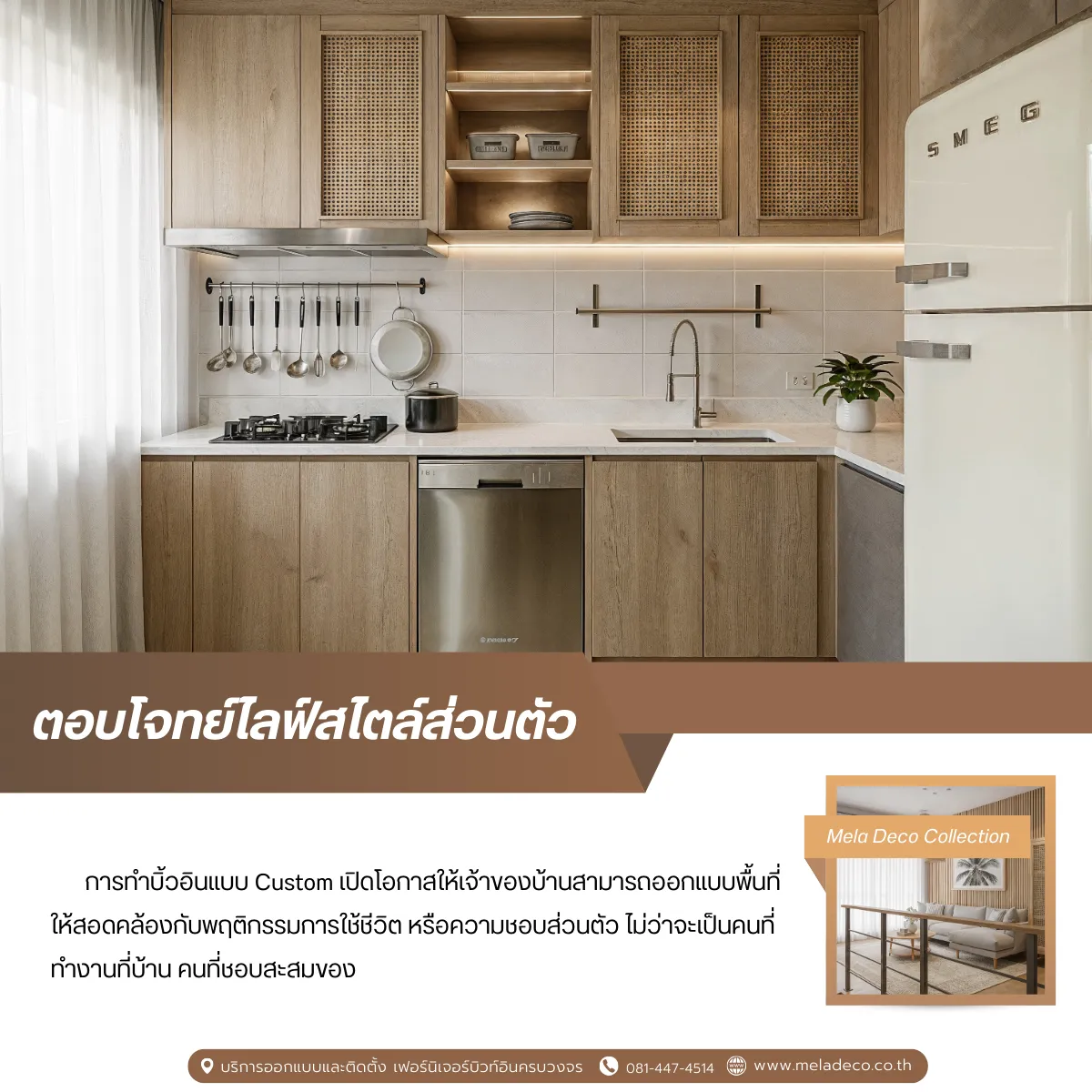 ทีมออกแบบ Mela Deco พร้อมให้คำปรึกษาแนวคิดการออกแบบ เลือกโทนสี วัสดุ และงานบิวท์อิน เพื่อให้บ้านของคุณสะท้อนถึงตัวตนของคุณให้มากที่สุด หากสนใจดูผลงานของเราสามารถดูคอลเลคชันต่าง ๆ เพิ่มเติมได้ที่บทความด้านล่างค่ะ