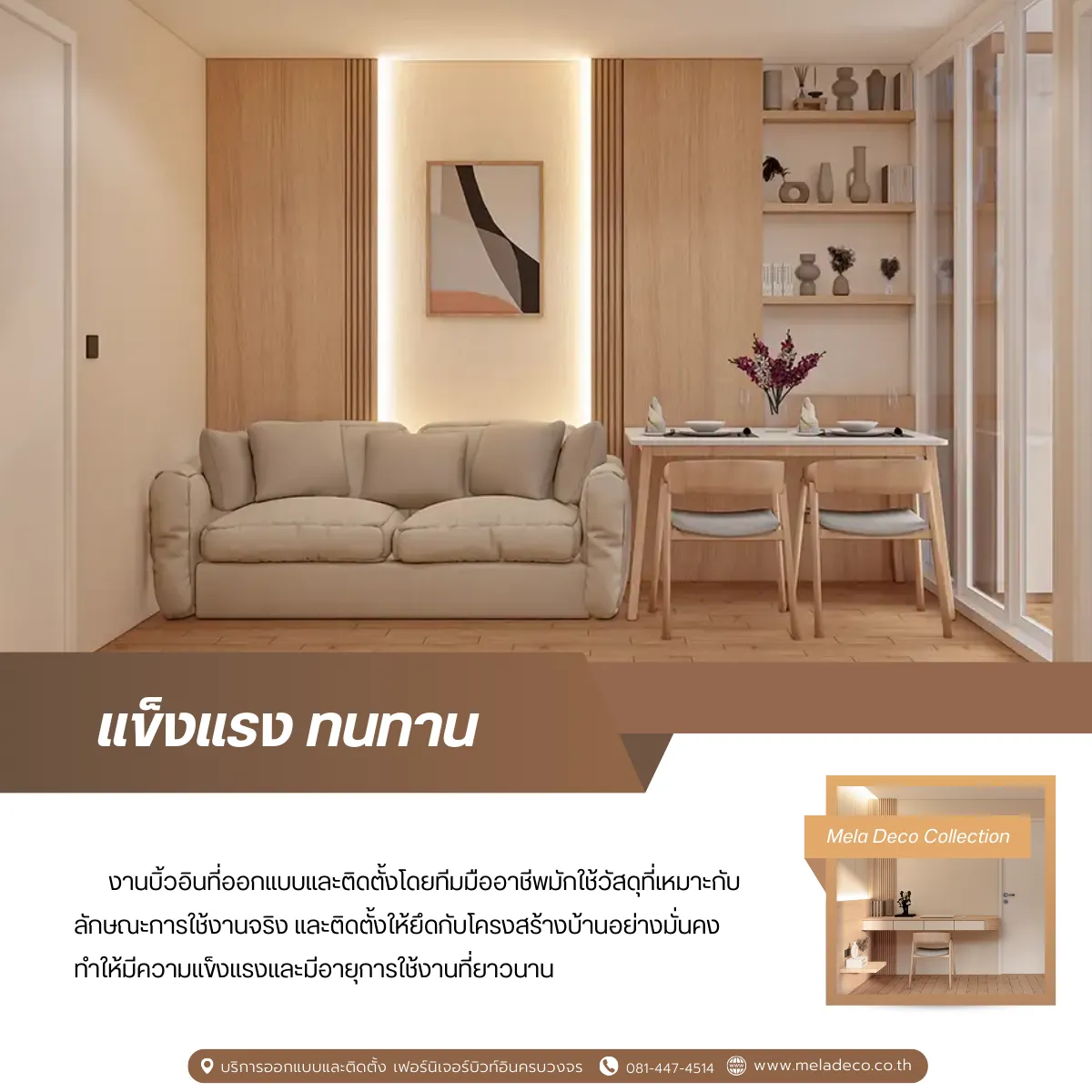 การทำบิ้วอินต้องอาศัยทั้งความรู้ด้านดีไซน์ โครงสร้าง และการติดตั้ง การเลือกบริษัทที่มีประสบการณ์จึงช่วยลดความเสี่ยงในการทำงานและช่วยให้ได้งานที่มีคุณภาพ บริษัทมืออาชีพจะช่วยวิเคราะห์พื้นที่จริง ออกแบบให้เหมาะกับการใช้งาน แนะนำวัสดุที่เหมาะสม และควบคุมคุณภาพการติดตั้ง ซึ่งช่วยให้ลูกค้าได้งานบิ้วอินที่ใช้งานได้จริงในระยะยาว Mela Deco นับเป็นผู้เชี่ยวชาญด้านงาน Custom Built-in ที่เข้าใจการใช้ชีวิตของลูกค้า เราเข้าใจทั้งเรื่องดีไซน์และการใช้งานในชีวิตประจำวัน ด้วยแนวคิดการออกแบบที่เน้นความสมดุลระหว่างความสวยงามและฟังก์ชันการใช้งาน Mela Deco ให้ความสำคัญกับการวิเคราะห์ไลฟ์สไตล์ของลูกค้าอย่างละเอียด เพื่อให้ทุกงานบิ้วอินสามารถใช้งานได้จริงในชีวิตประจำวัน ไม่ว่าจะเป็นงานบิ้วอินบ้าน คอนโด สำนักงาน หรือพื้นที่เชิงพาณิชย์ ทีมงานสามารถออกแบบให้เหมาะกับพื้นที่จริงและงบประมาณได้อย่างลงตัวตามความต้องการของลูกค้าเลยค่ะ