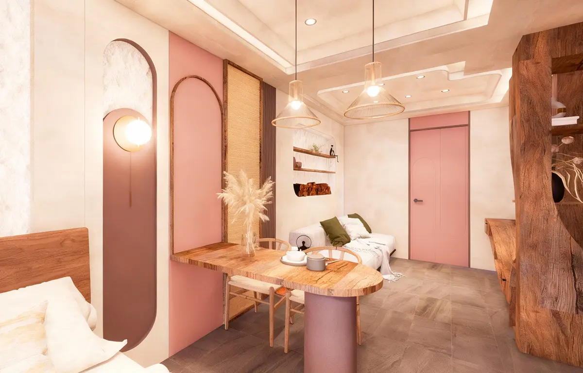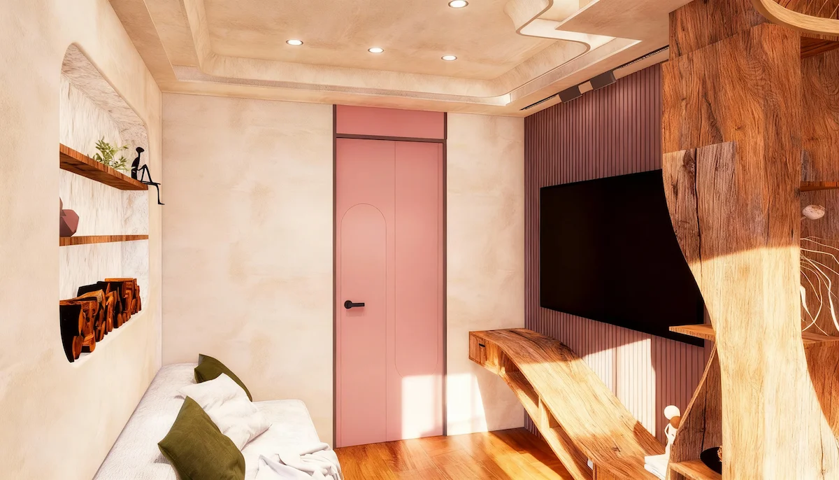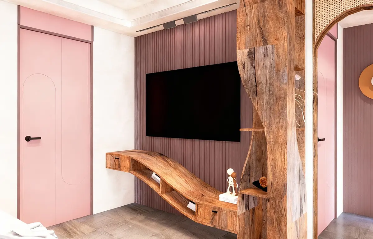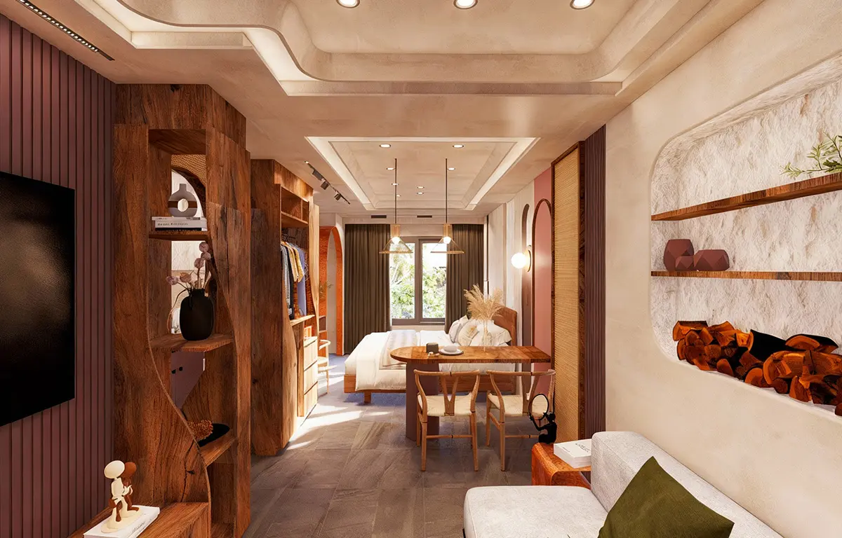 แรงบันดาลใจจากความงามที่เกิดขึ้นเมื่อ “ดิน ไม้ และแสง” รวมตัวกันอย่างกลมกลืน ห้องนี้สะท้อนเสน่ห์ของโทนอบอุ่นในแบบเทราคอตต้า ผ่านลายไม้ธรรมชาติที่โค้งไหลอย่างอิสระ และผนังที่ให้ผิวสัมผัสดุจดินปั้นแห้งในแสงบ่าย ทั้งหมดคือจังหวะของความสงบที่มีชีวิต คือการตีความคำว่า “บ้าน” ให้เป็นพื้นที่แห่งการพักใจ ที่อบอุ่น อ่อนโยน และเป็นธรรมชาติอย่างแท้จริง