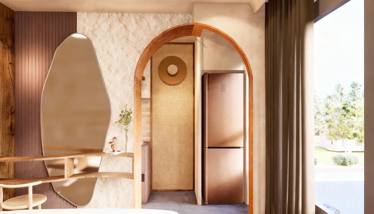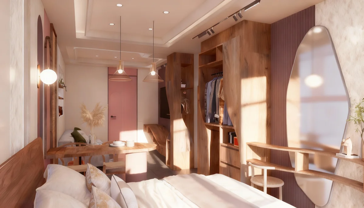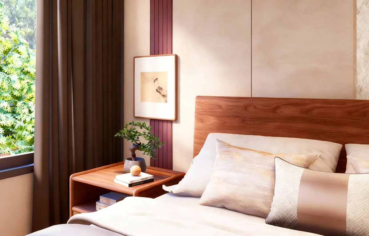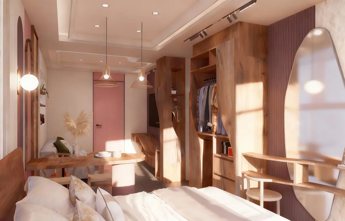 แรงบันดาลใจจากความงามที่เกิดขึ้นเมื่อ “ดิน ไม้ และแสง” รวมตัวกันอย่างกลมกลืน ห้องนี้สะท้อนเสน่ห์ของโทนอบอุ่นในแบบเทราคอตต้า ผ่านลายไม้ธรรมชาติที่โค้งไหลอย่างอิสระ และผนังที่ให้ผิวสัมผัสดุจดินปั้นแห้งในแสงบ่าย ทั้งหมดคือจังหวะของความสงบที่มีชีวิต คือการตีความคำว่า “บ้าน” ให้เป็นพื้นที่แห่งการพักใจ ที่อบอุ่น อ่อนโยน และเป็นธรรมชาติอย่างแท้จริง
