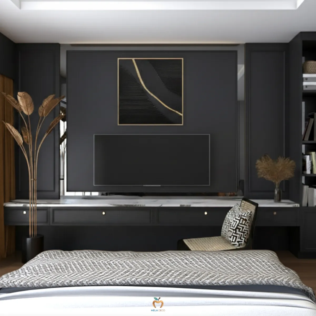 สิ่งที่โดดเด่นที่สุดของงานนี้คือการออกแบบที่ให้ความสำคัญกับความต่อเนื่องไม่ว่าจะเป็นผนังทีวี โต๊ะทำงาน ชั้นวางของ หรือผนังหัวเตียง ทุกองค์ประกอบถูกวางตำแหน่งอย่างลงตัว ส่งผลให้ภาพรวมของห้องดูสมดุลและมีความเป็นระเบียบ การเลือกใช้โทนสีดำด้านเป็นพื้นฐานของงานบิ้วอินยังช่วยสร้างความรู้สึกหนักแน่นและมั่นคงให้กับพื้นที่ ขณะที่เส้นสายสีทองที่แทรกอยู่ในบางจุดทำหน้าที่เพิ่มมิติและความหรูหราอย่างมีชั้นเชิง ทำให้ห้องดูสงบนิ่งแต่ไม่เรียบจนเกินไป