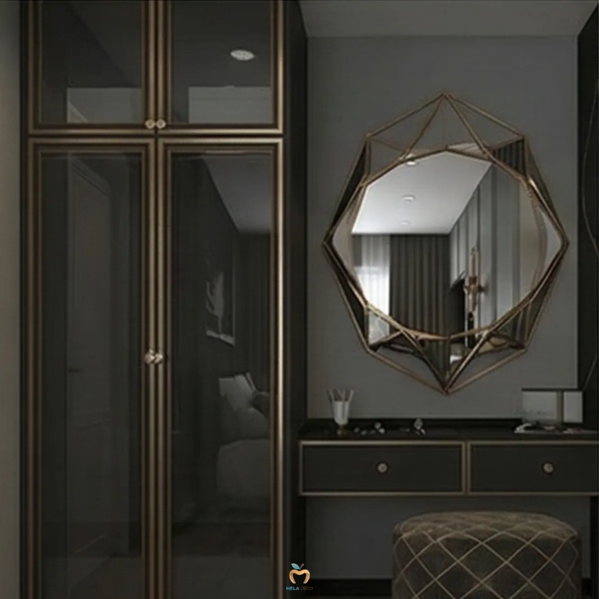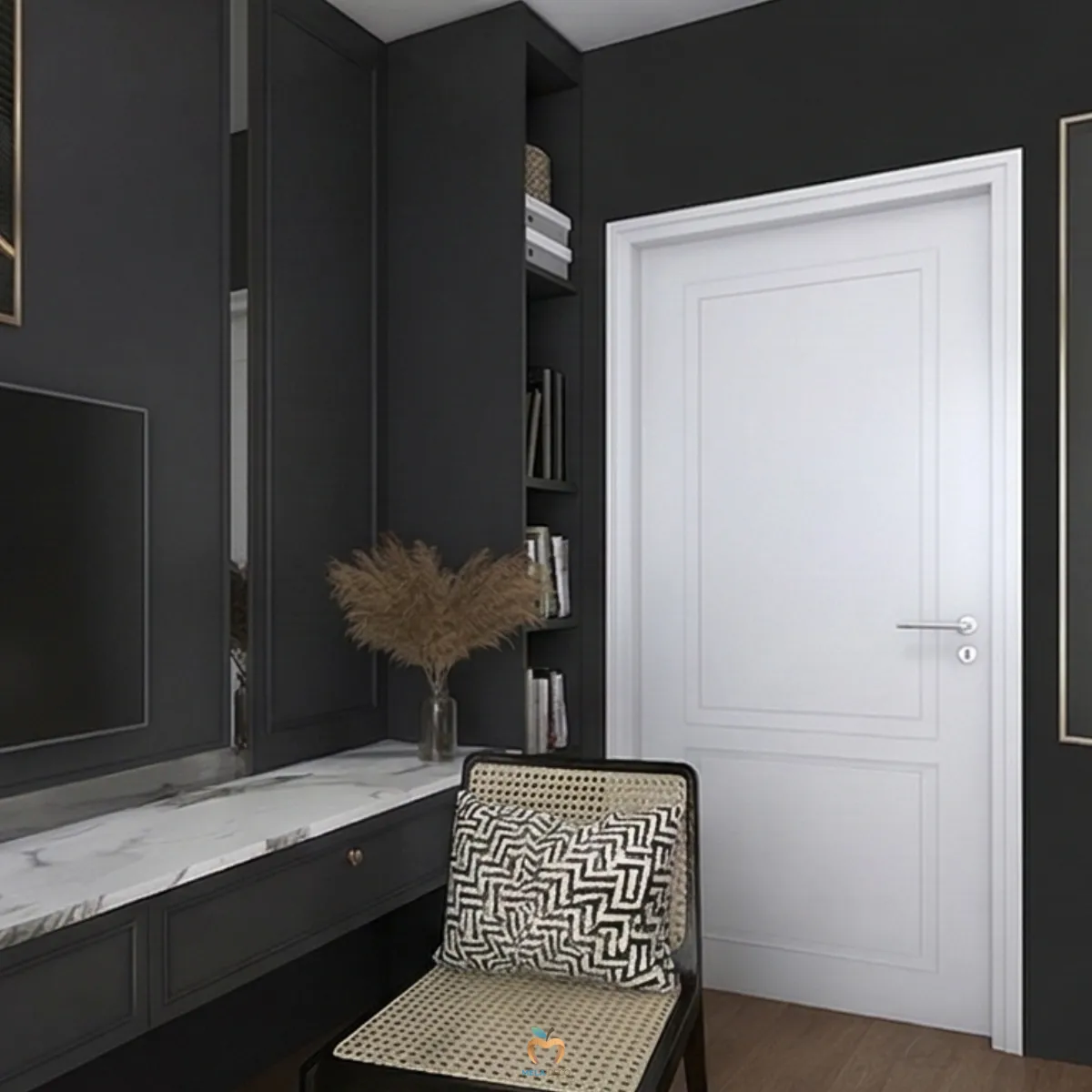 ตู้เสื้อผ้าบิ้วอินเราเลือกใช้ประตูกระจกและกรอบโลหะโทนสีทอง เพื่อเพิ่มความหรูหราให้กับพื้นที่ ตู้เสื้อผ้าเราตั้งใจออกแบบให้ใช้พื้นที่ผนังได้เต็มความสูง ทำให้สามารถจัดเก็บเสื้อผ้าและของใช้ได้มากกว่าตู้ลอยตัวทั่วไป นอกจากนี้ยังช่วยให้ห้องดูเป็นระเบียบมากขึ้น อีกทั้ง Mela Deco ยังตั้งใจวางไว้ใกล้กับโต๊ะเครื่องแป้ง เพื่อให้ผู้อยู่อาศัยใช้งานได้สะดวกมากยิ่งขึ้นเพราะเราคำนึงถึงการอยู่อาศัยจริงๆไม่เพียงแค่ความสวยงานเท่านั้นค่ะ