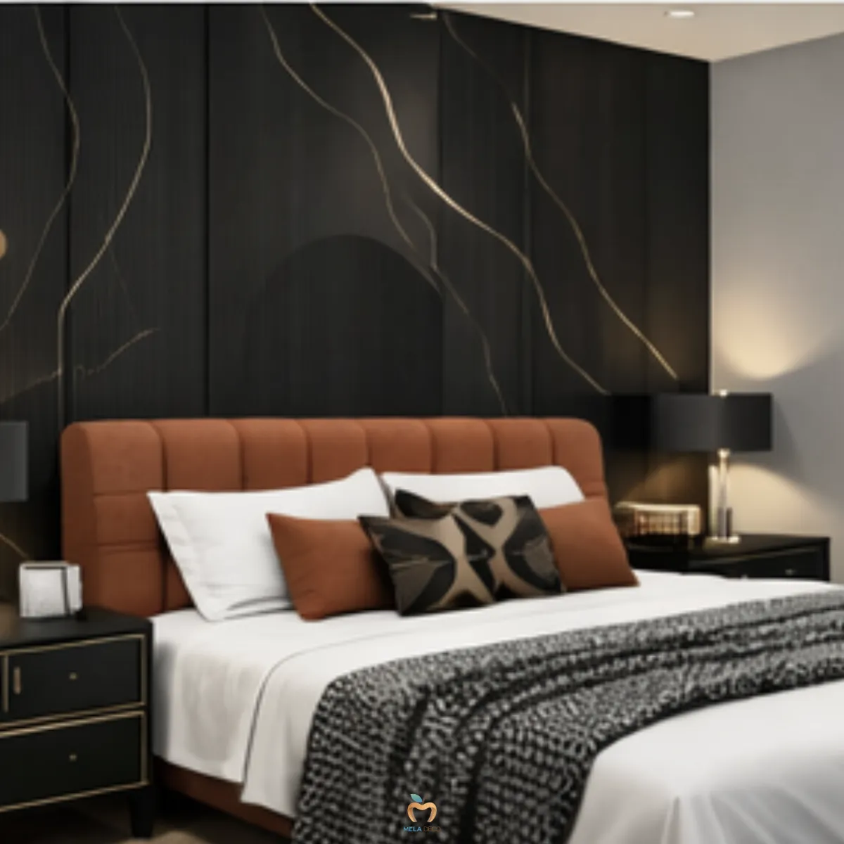 ผนังหัวเตียงถูกออกแบบเป็นบิ้วอินหินอ่อนสีดำลวดลายธรรมชาติ ที่ช่วยสร้างจุดเด่นให้กับพื้นที่พักผ่อนอย่างสงบและหรูหรา ลายเส้นของหินอ่อนช่วยเพิ่มมิติให้ผนังดูมีความลึกและมีเอกลักษณ์เฉพาะตัว เมื่อผสานกับเส้นตกแต่งโทนทองและแสงไฟแบบ Accent Lighting จึงช่วยขับให้บรรยากาศของห้องดูนิ่ง สุขุม และสะท้อนความหรูในแบบ Espresso ได้ดียิ่งขึ้นค่ะ