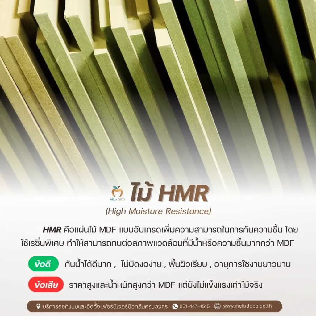 HMR คือแผ่นไม้ MDF แบบอัปเกรดเพิ่มความสามารถในการกันความชื้น โดยใช้เรซิ่นพิเศษ ทำให้สามารถทนต่อสภาพแวดล้อมที่มีน้ำหรือความชื้นมากกว่า MDF ปกติแบบเห็นได้ชัด เหมาะกับการนำไปทำเคาน์เตอร์ครัว , ตู้ใต้อ่างล้างหน้า , งานบิ้วอินใกล้หน้าต่างหรือพื้นที่ที่อาจโดนน้ำ , ตู้รองเท้าที่ใกล้ประตูหรือพื้นที่เปียกชื้นบ่อย Mela Deco เลือกใช้ HMR เป็นวัสดุมาตรฐานในงานที่ต้องการความทนทานเป็นพิเศษ เช่น ครัวหรือพื้นที่ที่มีความเสี่ยงเรื่องน้ำ เพราะต้องการให้ลูกค้าใช้งานได้ยาว ๆ โดยไม่ต้องกังวลเรื่องบวมในอนาคต ถือเป็นวัสดุที่คุ้มค่ามากเมื่อเทียบกับความทนชื้นที่ได้
