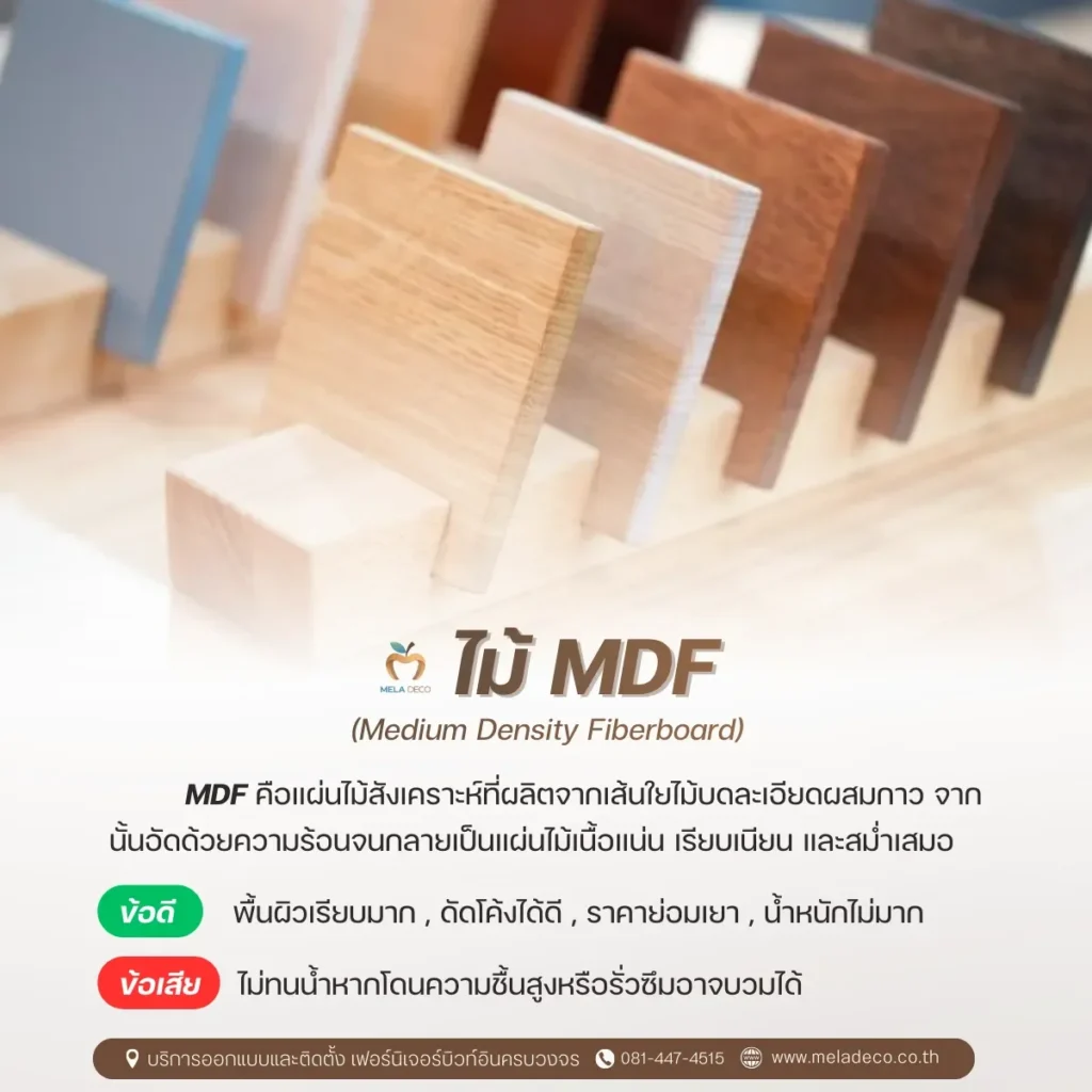 งานบิ้วอินไม่ว่าจะเป็นคอนโด บ้าน หรือโฮมออฟฟิศ ล้วนต้องอาศัยวัสดุที่เหมาะสมกับงบประมาณและรูปแบบการใช้งาน เพราะวัสดุคือหัวใจสำคัญที่จะกำหนดทั้งความสวยงาม ความทนทาน อายุการใช้งาน ตลอดจนภาพรวมของงานออกแบบ เมื่อเริ่มต้นทำเฟอร์นิเจอร์บิ้วอิน หลายคนจึงมักมีคำถามเดียวกันว่า ควรเลือกวัสดุอะไรดี MDF, HMR, ไม้จริง หรือไม้อัดแบบไหนคุ้มกับเงินที่สุด?” ในบทความนี้ Mela Deco จะพาไปรู้จักวัสดุยอดนิยมทั้ง 4 แบบ พร้อมแนะนำว่าเหมาะกับงานประเภทไหน จุดเด่น จุดด้อยเป็นอย่างไร และควรเลือกแบบไหนให้เหมาะกับงบและไลฟ์สไตล์ โดยอ้างอิงมุมมองของเราเพื่อให้คุณเลือกวัสดุได้อย่างมั่นใจและคุ้มค่าที่สุดค่ะ