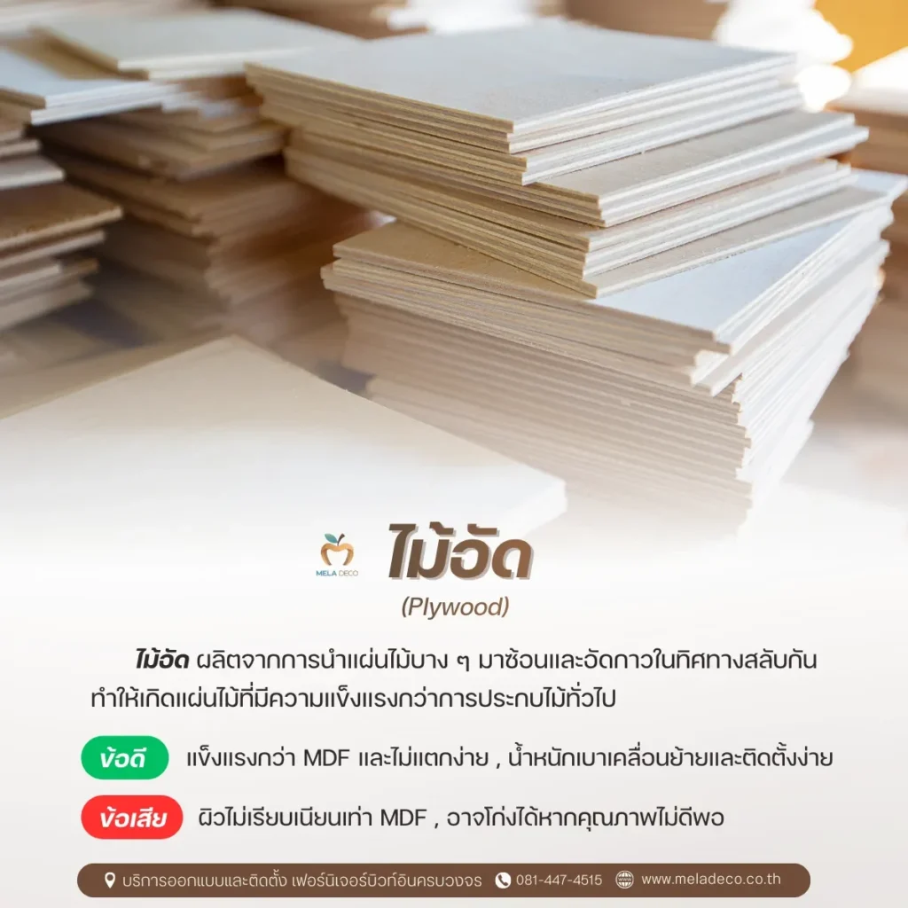 ไม้อัด ผลิตจากการนำแผ่นไม้บาง ๆ มาซ้อนและอัดกาวในทิศทางสลับกัน ทำให้เกิดแผ่นไม้ที่มีความแข็งแรงกว่าการประกบไม้ทั่วไป ทั้งยังเบากว่าไม้จริงและมีราคาสมเหตุสมผล จึงเป็นหนึ่งในตัวเลือกยอดนิยมของงานบิ้วอินหลากหลายรูปแบบ ซึ่งเหมาะกับชั้นวางของที่ต้องรับน้ำหนัก , ตู้ครัว , ตู้เก็บของในบ้าน , งานที่ต้องการความแข็งแรงและน้ำหนักเบา