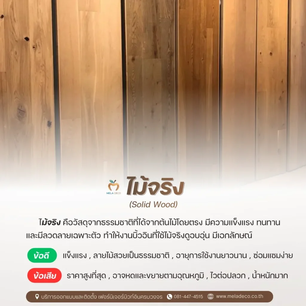ไม้จริง คือวัสดุจากธรรมชาติที่ได้จากต้นไม้โดยตรง มีความแข็งแรง ทนทาน และมีลวดลายเฉพาะตัว ทำให้งานบิ้วอินที่ใช้ไม้จริงดูอบอุ่น มีเอกลักษณ์ และให้ความรู้สึกหรูหราอย่างชัดเจน เหมาะกับงานที่ต้องการโชว์ลายไม้ธรรมชาติ , ประตูบานใหญ่ , ผนังไม้ , งานบ้านสไตล์ญี่ปุ่น มินิมอล โมเดิร์นลักซ์ แม้ไม้จริงจะมีราคาสูง แต่ Mela Deco มักเลือกใช้เฉพาะจุดที่ต้องการความโดดเด่น เช่น ฟาซาดตกแต่ง ผนังหลังทีวี หรือมือจับ เพื่อให้ได้ลุคหรูและอบอุ่น โดยไม่ทำให้ต้นทุนทั้งงานสูงเกินไป เป็นการผสมผสานอย่างชาญฉลาดให้หรูแบบคุ้มค่า