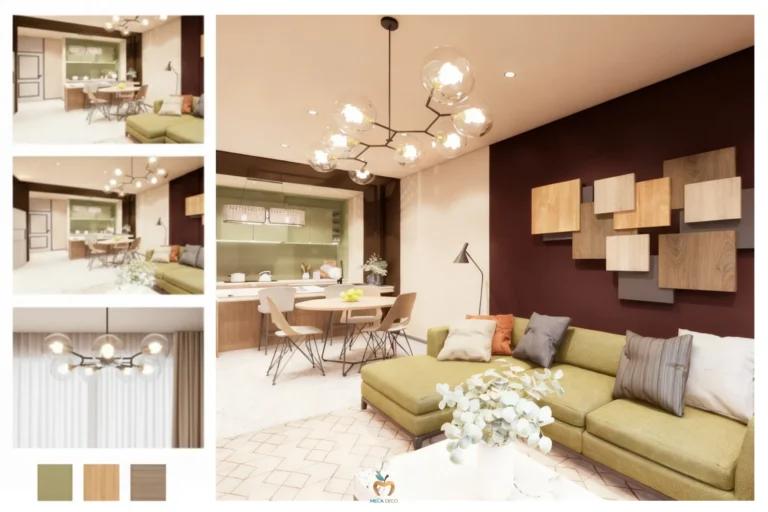 สีคือหัวใจของอารมณ์ใน Matcha Flow การเลือกใช้โทนสี Olive Green, Sand Beige และ White Marble คือการคืนจิตใจให้กลับสู่ธรรมชาติ ห้องนั่งเล่นจึงเปี่ยมด้วยความอบอุ่นของผนังไม้ธรรมชาติ ตัดกับโซฟาผ้าเฉดเขียวมัจฉะนุ่มตาและหมอนโทนเอิร์ธโทน ส่วนพื้นไม้สีอ่อนให้ความรู้สึกมั่นคงราวกับพื้นดินที่รองรับลมหายใจของบ้าน เมื่อแสงธรรมชาติเคลื่อนผ่านในแต่ละโมงยาม สีและพื้นผิวเหล่านี้ก็เปลี่ยนโทนอย่างมีชีวิต ไม่ต่างจากภูมิทัศน์ที่แปรเปลี่ยนตามแสงอาทิตย์