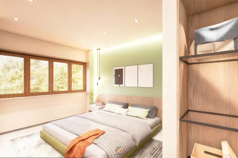 ห้องนอนยังคงใช้หลักเดียวกัน โทนไม้เบจผสมแสงไฟ soft white เมื่อเปิดไฟในยามค่ำคืน ผนังสีเขียวอ่อนจะสะท้อนความอบอุ่นให้ทั้งห้องดูละมุนเป็นพาเล็ตต์ที่ไม่เพียงสวยแต่สงบในทุกมุมมอง เพื่อให้คุณพักผ่อนนอนหลับได้อย่างสบายใจ