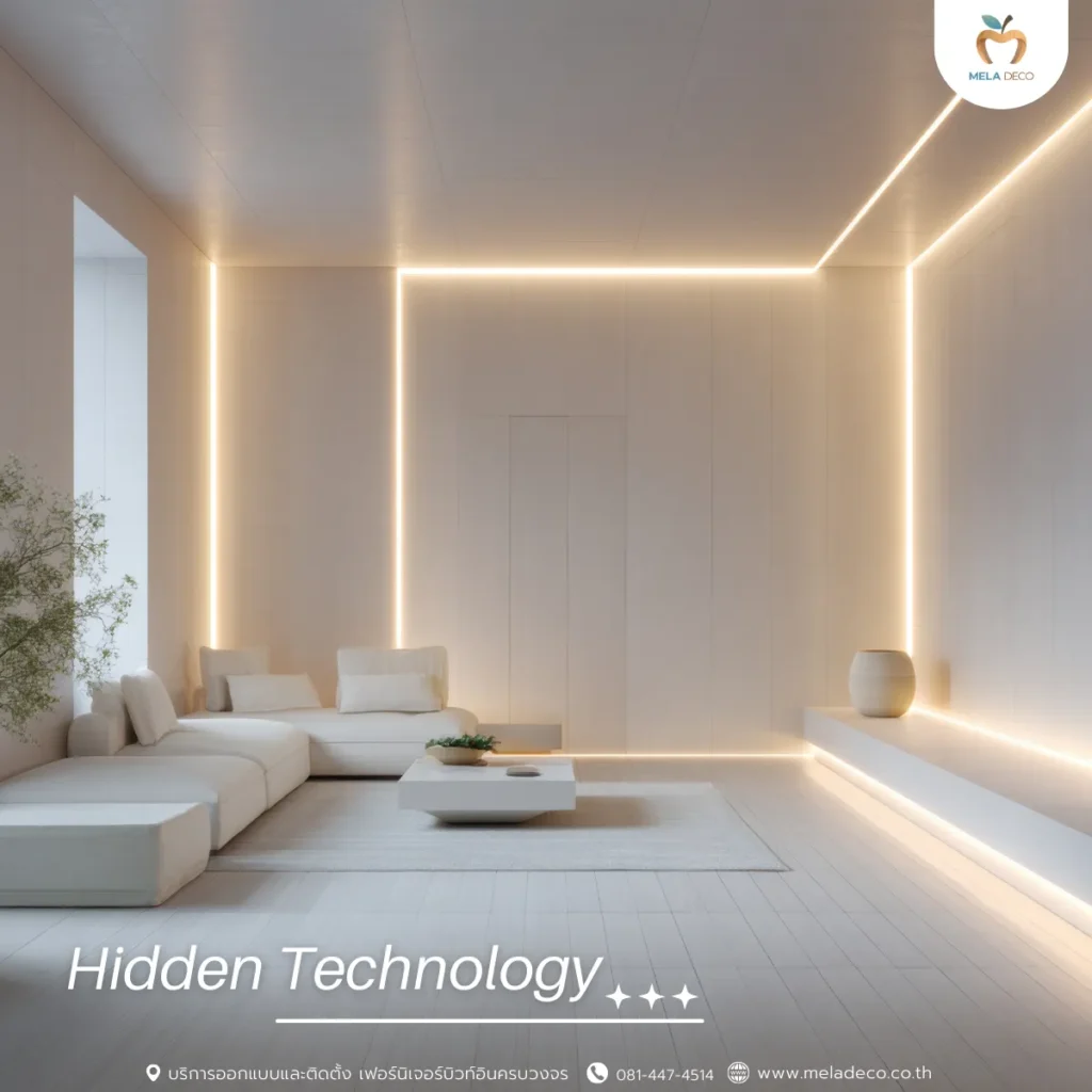ในยุคที่บ้านเต็มไปด้วย Smart Home คนรักสไตล์ Minimal จะให้ความสำคัญกับการซ่อนเทคโนโลยีเหล่านี้ไม่ให้ดูรกรกสายตา เช่น การเลือกใช้ทีวีที่ดูเหมือนกรอบรูปไม้เมื่อปิดเครื่อง การซ่อนสายไฟอย่างเป็นระเบียบ หรือการใช้ลำโพงที่ออกแบบมาให้กลมกลืนไปกับของตกแต่งบ้าน ความ Minimal ในเชิงฟังก์ชันคือการที่เทคโนโลยีต้องคอยอำนวยความสะดวกให้เรา โดยที่เราไม่ต้องเห็นความวุ่นวายของมันนั่นเองค่ะ