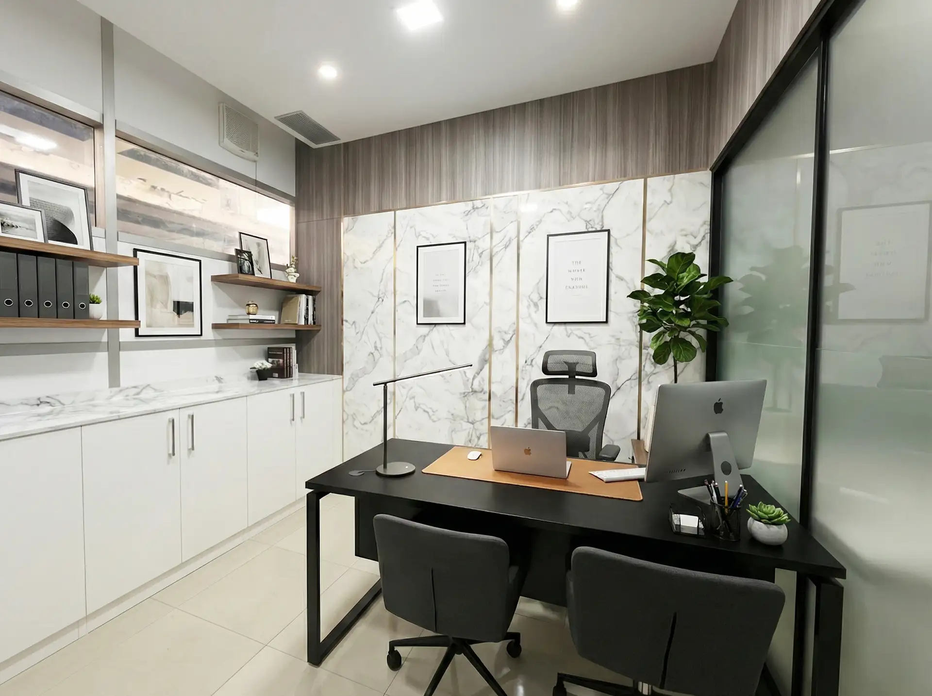 ผลงานออกแบบและติดตั้ง Built-in ภายในห้องทำงาน ที่เน้นความเรียบหรู สุขุม และเป็นมืออาชีพ โดย Mela Deco เลือกใช้โทนสีเข้มตัดกับผิวสัมผัสหินลายอ่อน เพื่อสร้างบรรยากาศที่ดูน่าเชื่อถือและมีความเป็นทางการ เหมาะกับการใช้งานทั้งในมุมบริหารและการประชุมงานสำคัญ การออกแบบผนังด้วยแผงหินลายหินอ่อนช่วยเพิ่มมิติให้พื้นที่โดยไม่ดูหนักเกินไป ขณะที่เส้นสายแนวตั้งถูกจัดวางอย่างเป็นจังหวะ ทำให้ห้องดูเป็นระเบียบและมีพลังในเชิงสถาปัตยกรรม