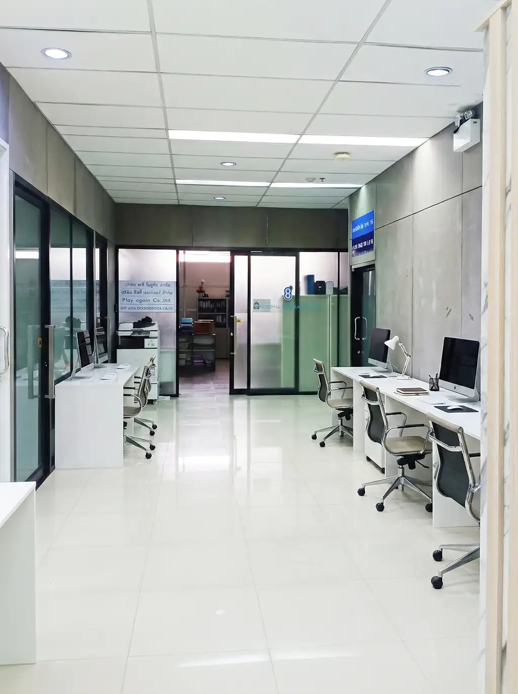 เฟอร์นิเจอร์ถูกออกแบบและเลือกใช้อย่างพอดี เน้นฟังก์ชันการใช้งานจริง ผสานกับงานบิ้วท์อินที่ช่วยจัดเก็บอุปกรณ์และเอกสารได้อย่างเป็นสัดส่วน พร้อมเสริมด้วยผนังกระจกฝ้าเพื่อแบ่งพื้นที่ใช้งานโดยยังคงความเป็นส่วนตัว แต่ไม่ทำให้ห้องดูอึดอัด แสงสว่างถูกออกแบบให้สมดุลระหว่างแสงธรรมชาติและแสงไฟ เพื่อสร้างบรรยากาศที่เอื้อต่อการทำงานและการตัดสินใจ ภาพรวมของโครงการสะท้อนตัวตนของออฟฟิศยุคใหม่ ที่ให้ความสำคัญกับภาพลักษณ์ ความเรียบร้อย และประสบการณ์การใช้งานในทุกมิติอย่างลงตัว
