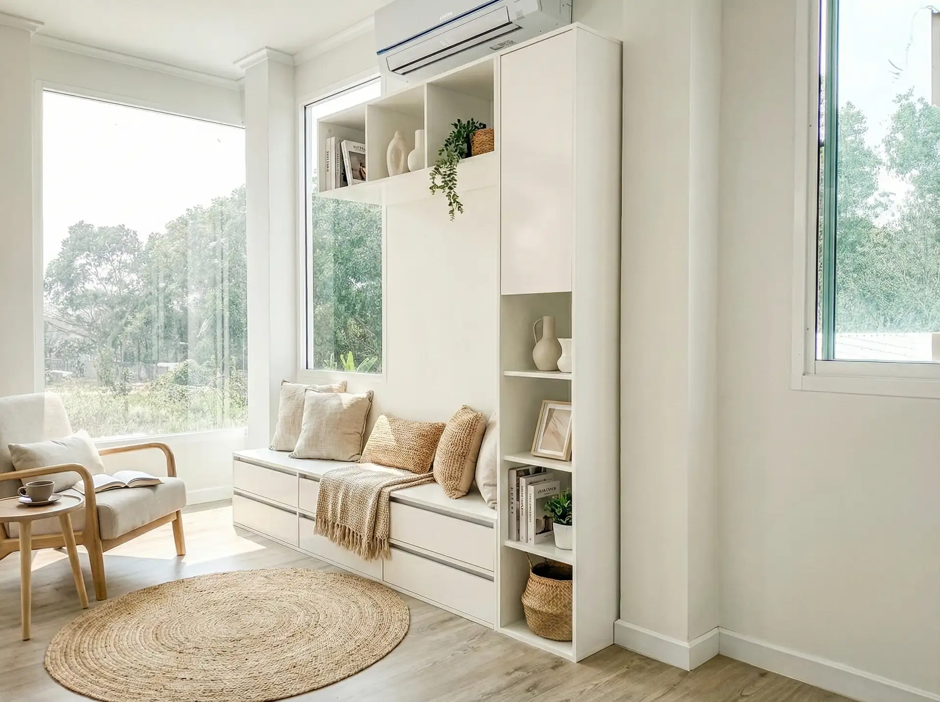 ผลงานออกแบบและติดตั้ง Built-in โดย Mela Deco ที่เลือกใช้โทนสีขาวและลายไม้ธรรมชาติ เพื่อสร้างบรรยากาศที่ สว่าง คลีน และผ่อนคลาย เหมาะกับพื้นที่อยู่อาศัยที่ต้องการความโปร่งโล่งและใช้งานง่ายในทุกวัน งานทั้งหมดถูกออกแบบให้รับกับแสงธรรมชาติจากช่องหน้าต่างขนาดใหญ่ ทำให้พื้นที่ดูสดใสและเป็นระเบียบมากขึ้น