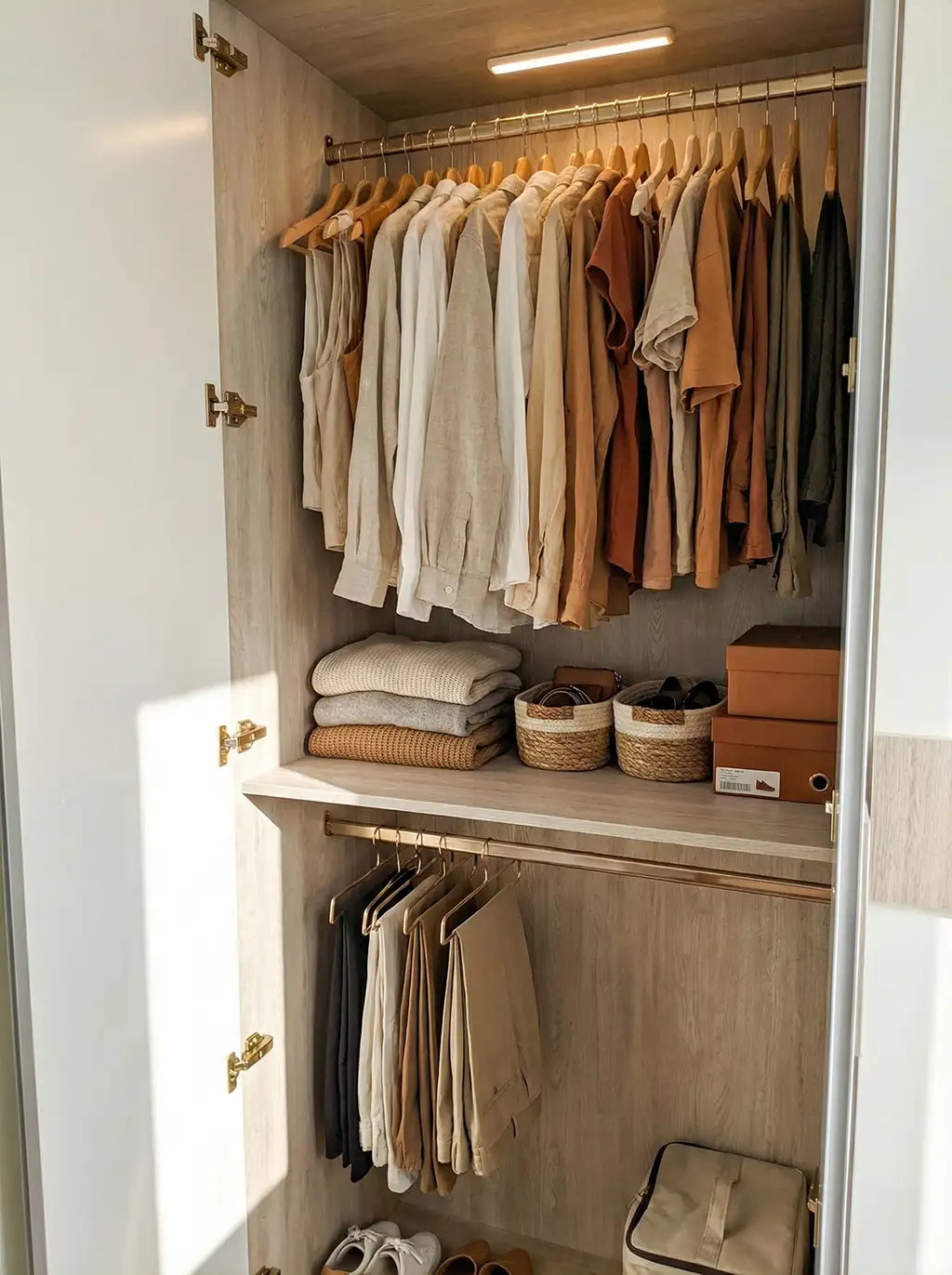 ตู้เสื้อผ้าแบบ Full-height ใช้ดีไซน์สีขาวเรียบตัดด้วยลายไม้ธรรมชาติบริเวณคาดกลางและกรอบด้านนอก ช่วยเติมความอบอุ่นให้ห้องโดยไม่ทำให้พื้นที่ดูหนัก ช่องเก็บของภายในถูกจัดวางอย่างมีระบบ ทั้งราวแขวน ลิ้นชัก และพื้นที่โล่งสำหรับการจัดเก็บที่เป็นระเบียบ