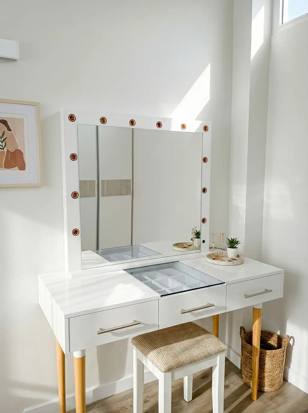 มุมโต๊ะเครื่องแป้งถูกออกแบบให้ใช้งานได้จริงในทุกวัน พร้อมลิ้นชักกระจกใสที่ช่วยให้เห็นเครื่องประดับและของใช้ได้ชัดเจน เพิ่มความสะดวกในการหยิบใช้งาน กระจกไฟรอบด้านช่วยเพิ่มความสว่างอย่างเหมาะสม ทำให้มุมแต่งตัวดูพรีเมียมและใช้งานได้สบายขึ้น ขาโต๊ะลายไม้ช่วยบาลานซ์โทนสีขาวให้ดูอบอุ่นและเป็นธรรมชาติ