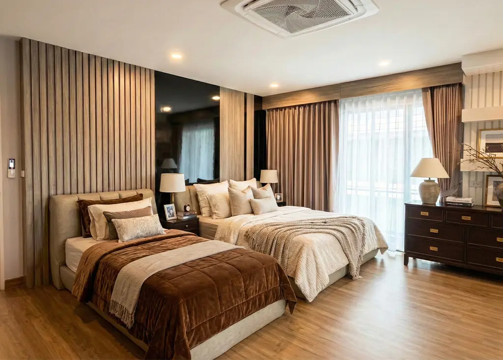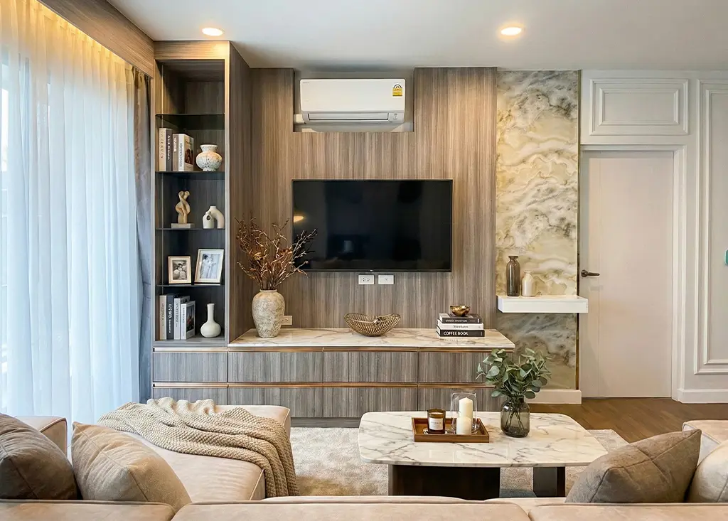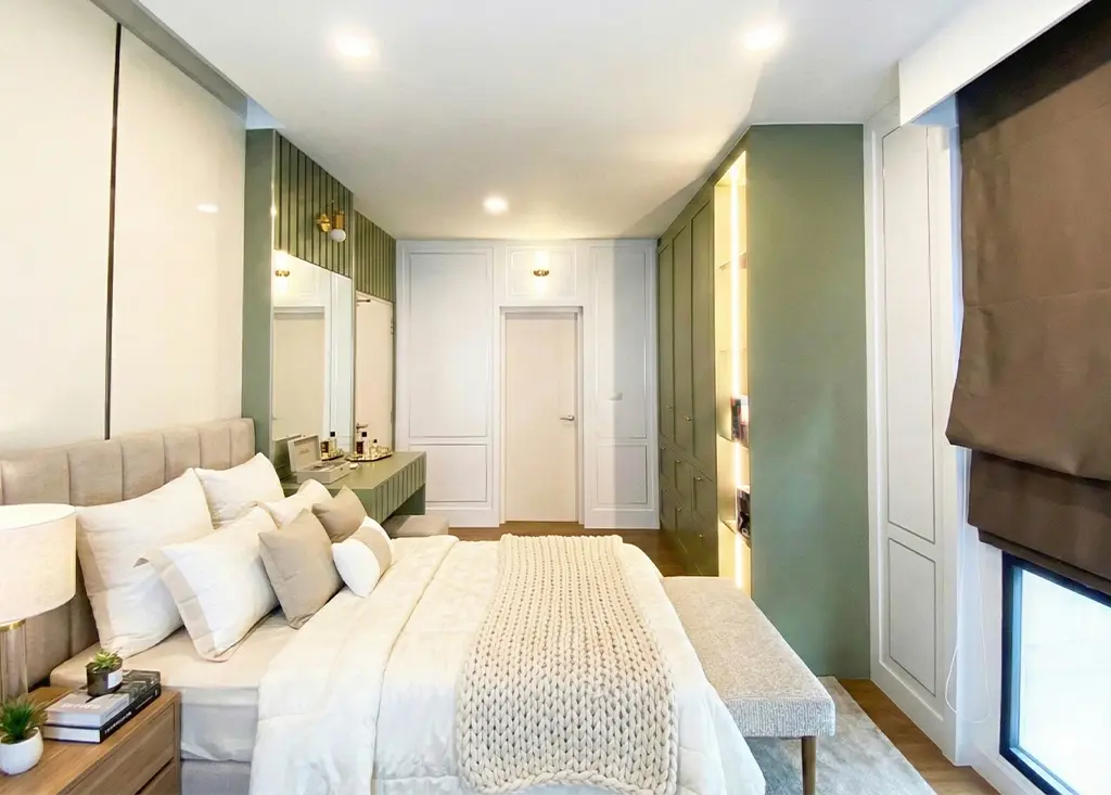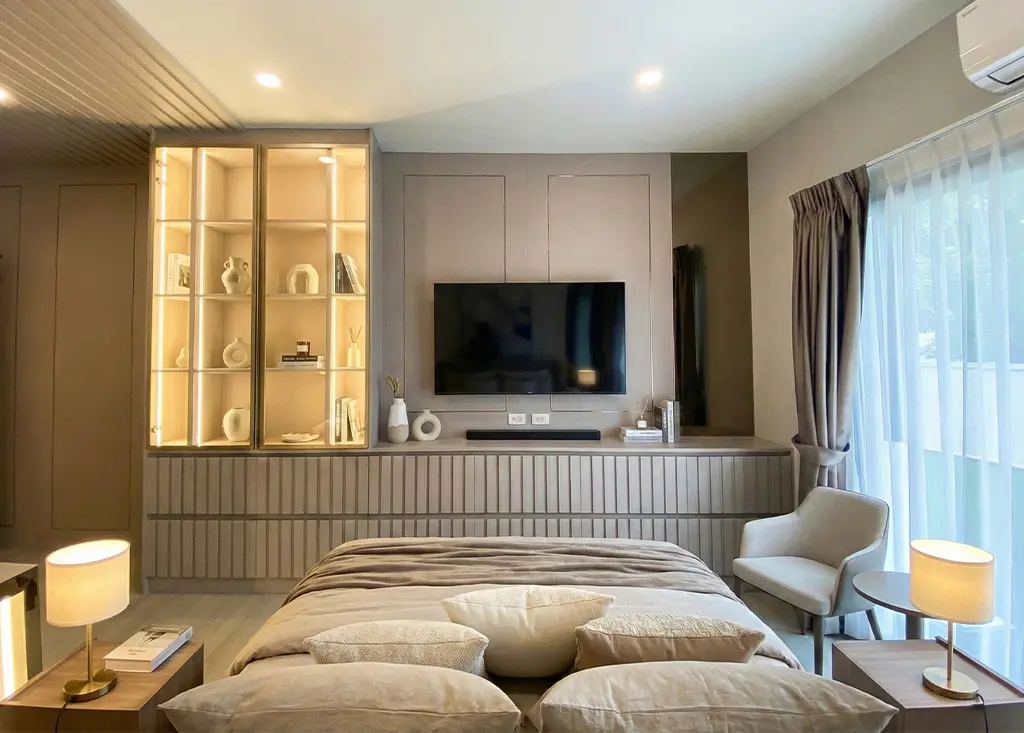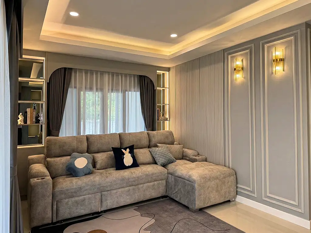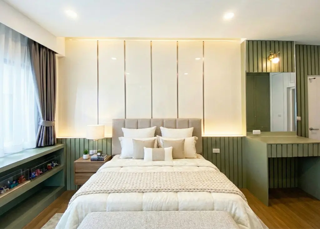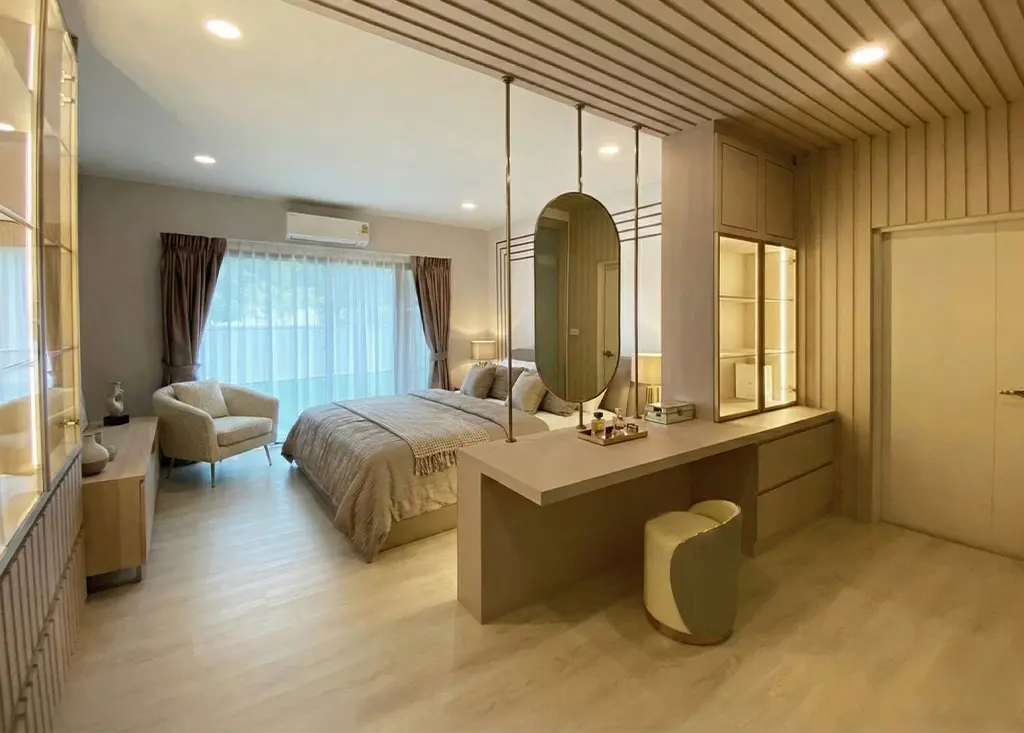 ภายในห้องนอนเน้นความเรียบหรูด้วย หัวเตียงและเฟอร์นิเจอร์โทนเทาอ่อน ตกแต่งด้วย เส้นขอบสีทอง–เงิน เพิ่มมิติความหรูหราอย่างมีระดับ ส่วนห้องนั่งเล่นเลือกใช้ โทนขาวผสมลายไม้ เพื่อสร้างความอบอุ่น พร้อมผนัง ลายหินอ่อน ที่กลายเป็นจุดเด่นของห้อง ช่วยเติมเต็มบรรยากาศให้ทั้ง หรูและผ่อนคลาย ในเวลาเดียวกัน
