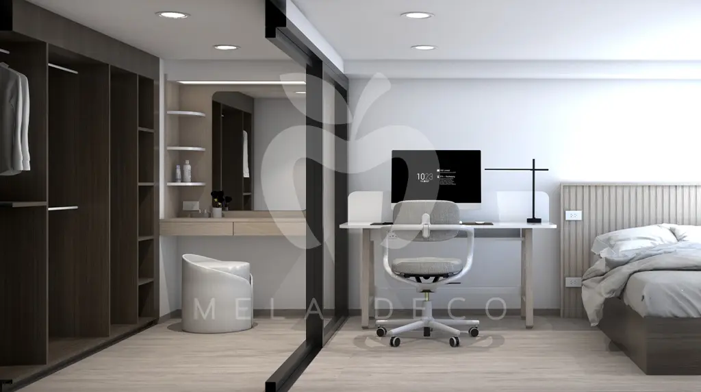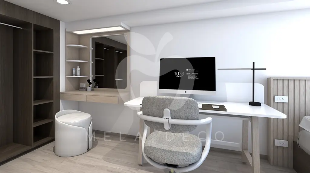 ในส่วนของโต๊ะเครื่องแป้ง ออกแบบให้เป็นฟังก์ชันบิ้วท์อินที่เชื่อมต่อกับพื้นที่ใช้งานอื่นอย่างลงตัว เลือกใช้โทนสีอ่อนและวัสดุผิวสัมผัสเรียบ เพื่อคงความโปร่ง โล่ง และสะอาดตา พร้อมจัดสัดส่วนช่องเก็บของให้เหมาะกับการใช้งานจริง ช่วยให้พื้นที่ดูเป็นระเบียบและใช้งานได้อย่างคล่องตัว ภาพรวมของงานออกแบบสะท้อนแนวคิด Modern Minimal Living ที่ให้ความสำคัญกับความเรียบง่าย ความสบาย และรายละเอียดงานบิ้วท์อินที่ช่วยยกระดับคุณภาพการอยู่อาศัยในทุกวัน