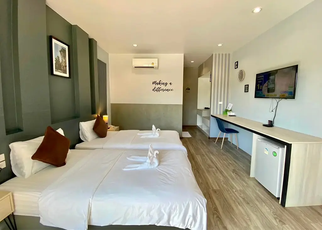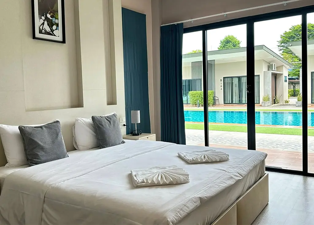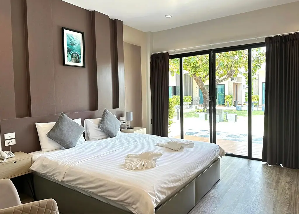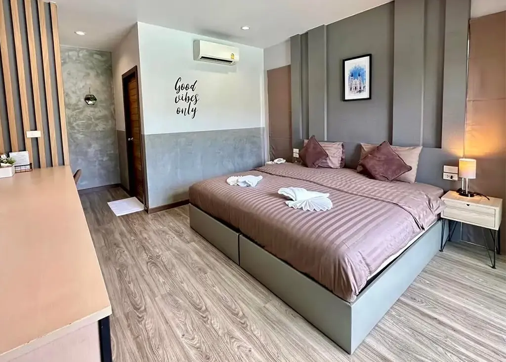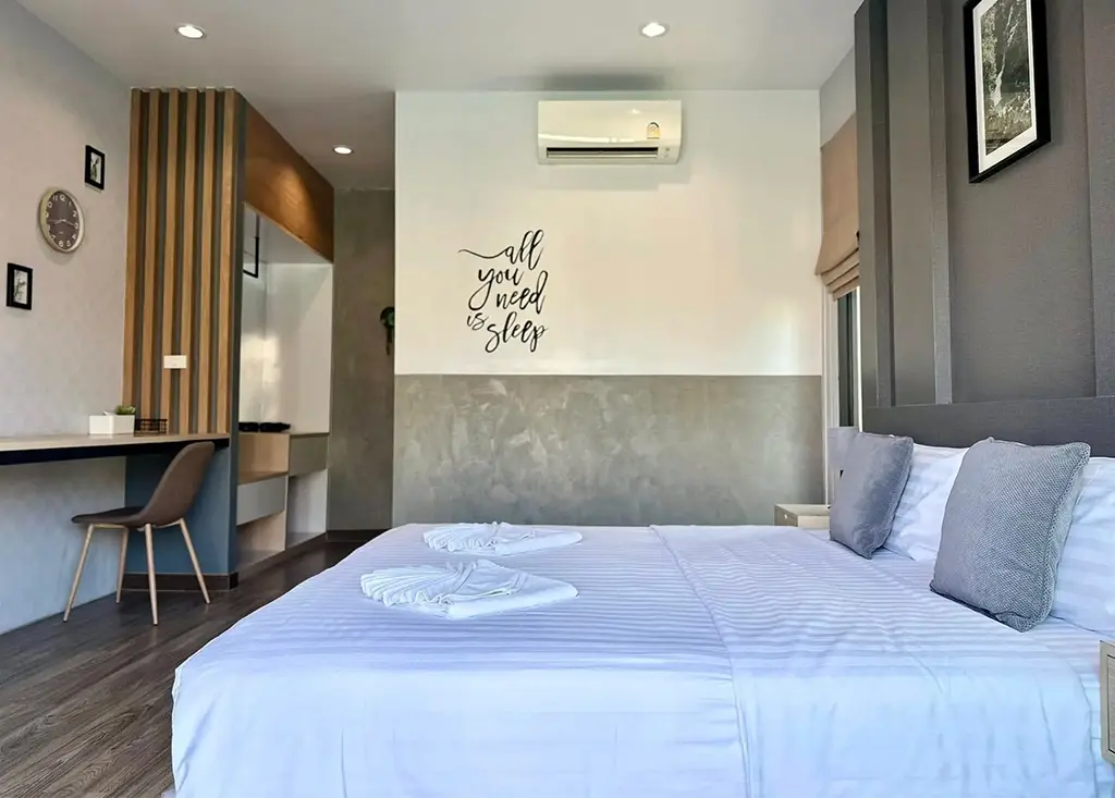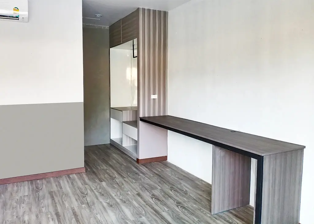 ผลงานออกแบบและติดตั้งตู้, โต๊ะ Built-In ภายในห้องพักที่มุ่งเน้นการสร้าง “ประสบการณ์แห่งการพักผ่อน” อย่างแท้จริง โดย Mela Deco คอนเซปต์หลักคือ Modern Cozy ที่ผสมผสานความเรียบง่ายเข้ากับฟังก์ชันการใช้งานที่ครบครัน งานตกแต่งโดดเด่นด้วยการเลือกใช้วัสดุลายไม้ตัดกับผนังโทนสีเทาและงานผิวสัมผัสแบบลอฟท์ (Loft Texture) เพื่อสร้างมิติให้ห้องดูไม่เรียบจนเกินไป เสริมด้วยการคุมโทนสีแนว Earth Tone และ Warm White เพื่อสร้างบรรยากาศที่อบอุ่น นุ่มนวล และเชื้อเชิญให้ผู้เข้าพักได้ผ่อนคลายทันทีที่ก้าวเข้ามา การดีไซน์เน้นความโปร่งโล่งสบาย พร้อมสอดแทรกดีเทลที่ทันสมัยผ่านงานผนังตกแต่งและงานเฟอร์นิเจอร์ เพื่อให้รีสอร์ทแห่งนี้เป็นจุดหมายของการชาร์จพลังที่สมบูรณ์แบบ