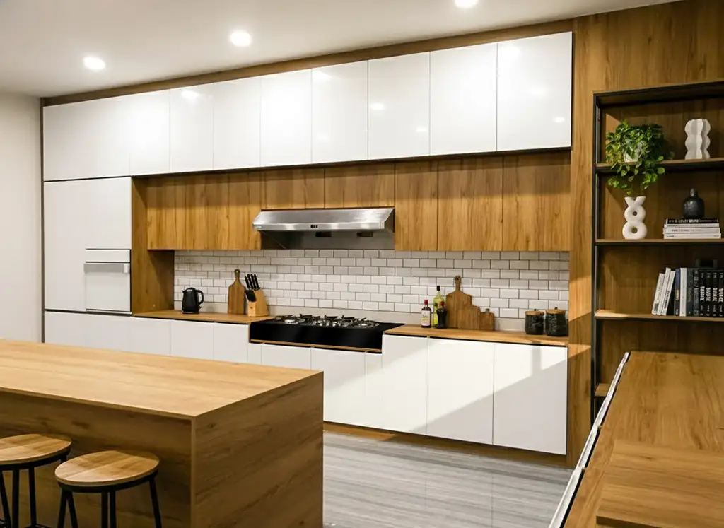 โครงสร้างบิลต์อินเลือกใช้ วัสดุลามิเนตลายไม้โทนอุ่น เพื่อสร้างบรรยากาศที่อบอุ่นน่าใช้งาน ตัดกับหน้าบานโทน สีเข้มแบบแมตต์ เพิ่มมิติให้ครัวดูโมเดิร์นและมีเอกลักษณ์