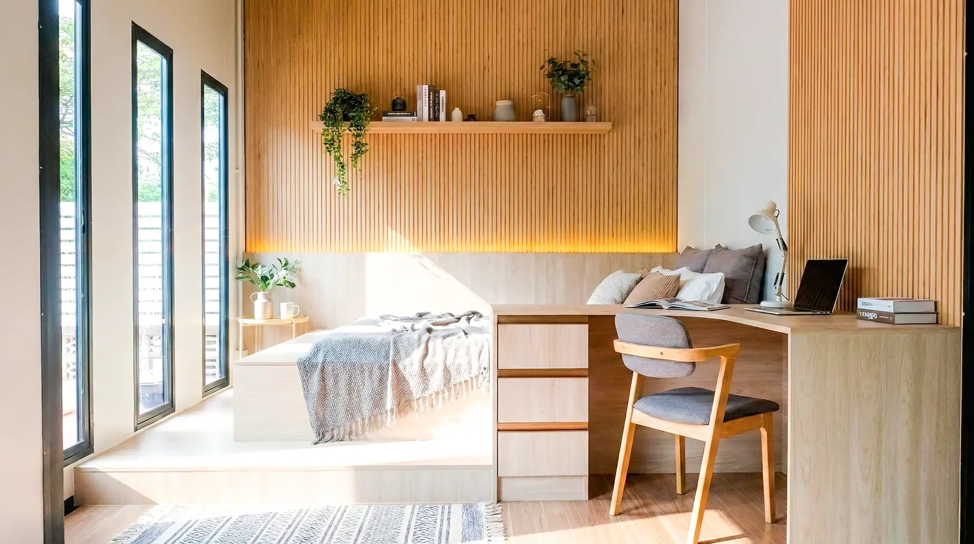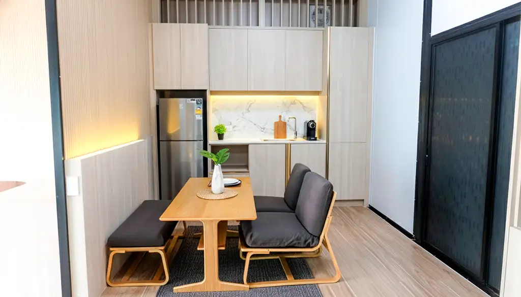 ทีม Mela Deco ออกแบบเส้นสายแนวตั้งในงาน ผนังและบิลต์อิน เพื่อยืดสัดส่วนของห้องให้ดูสูงโปร่งขึ้น พร้อมเพิ่มความรู้สึกกว้างขวางและเป็นระเบียบในทุกมุมมอง ทุกองค์ประกอบตั้งแต่โทนไม้ แสงไฟซ่อน ไปจนถึงเส้นสายที่คุมโทน ล้วนถูกออกแบบให้ ทำงานร่วมกันอย่างกลมกลืน เพื่อให้บ้านน็อคดาวน์หลังนี้กลายเป็นพื้นที่ที่ทั้ง เรียบง่าย อบอุ่น และมีสไตล์ในแบบเฉพาะของ Mela Deco