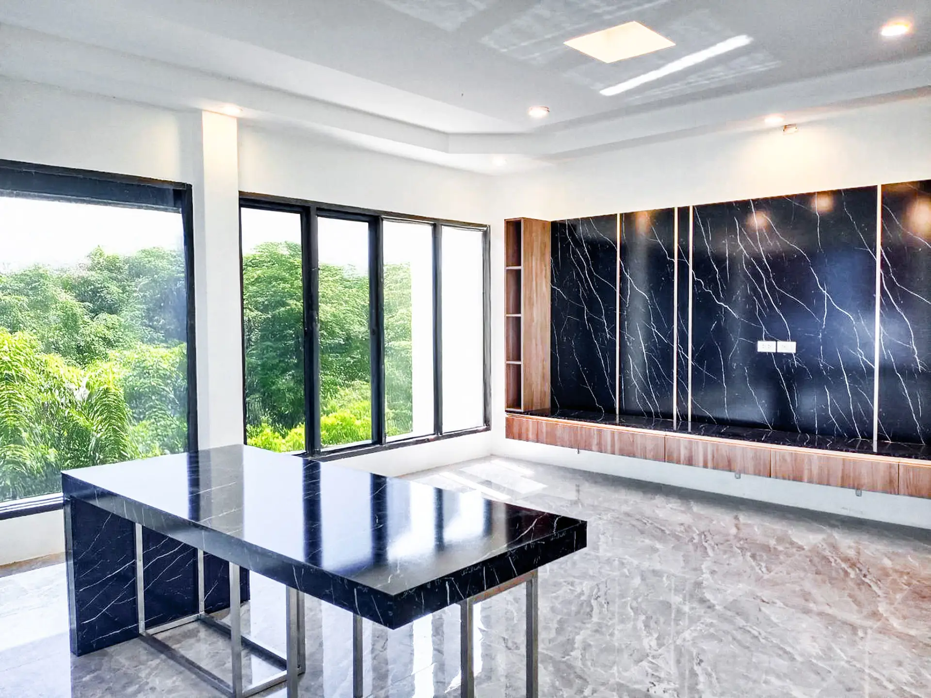 พื้นที่ห้องกลางถูกออกแบบให้เป็นมุมทำกิจกรรมเอนกประสงค์ของบ้าน ใช้ชั้น Built-in เอนกประสงค์ลายหินอ่อนสีดำ เพื่อสร้างจุดนำสายตาและกำหนดคาแรกเตอร์ของห้อง โต๊ะกลางลายหินอ่อนโทนเข้มช่วยให้พื้นที่ดูมั่นคงและหรูหรา ขณะเดียวกันก็รองรับการใช้งานหลากหลาย ไม่ว่าจะเป็นรับแขก จัดกิจกรรม หรือนั่งพักผ่อนท่ามกลางมุมมองธรรมชาติรอบด้านที่ส่องผ่านประตูบานกระจกเต็มบาน
