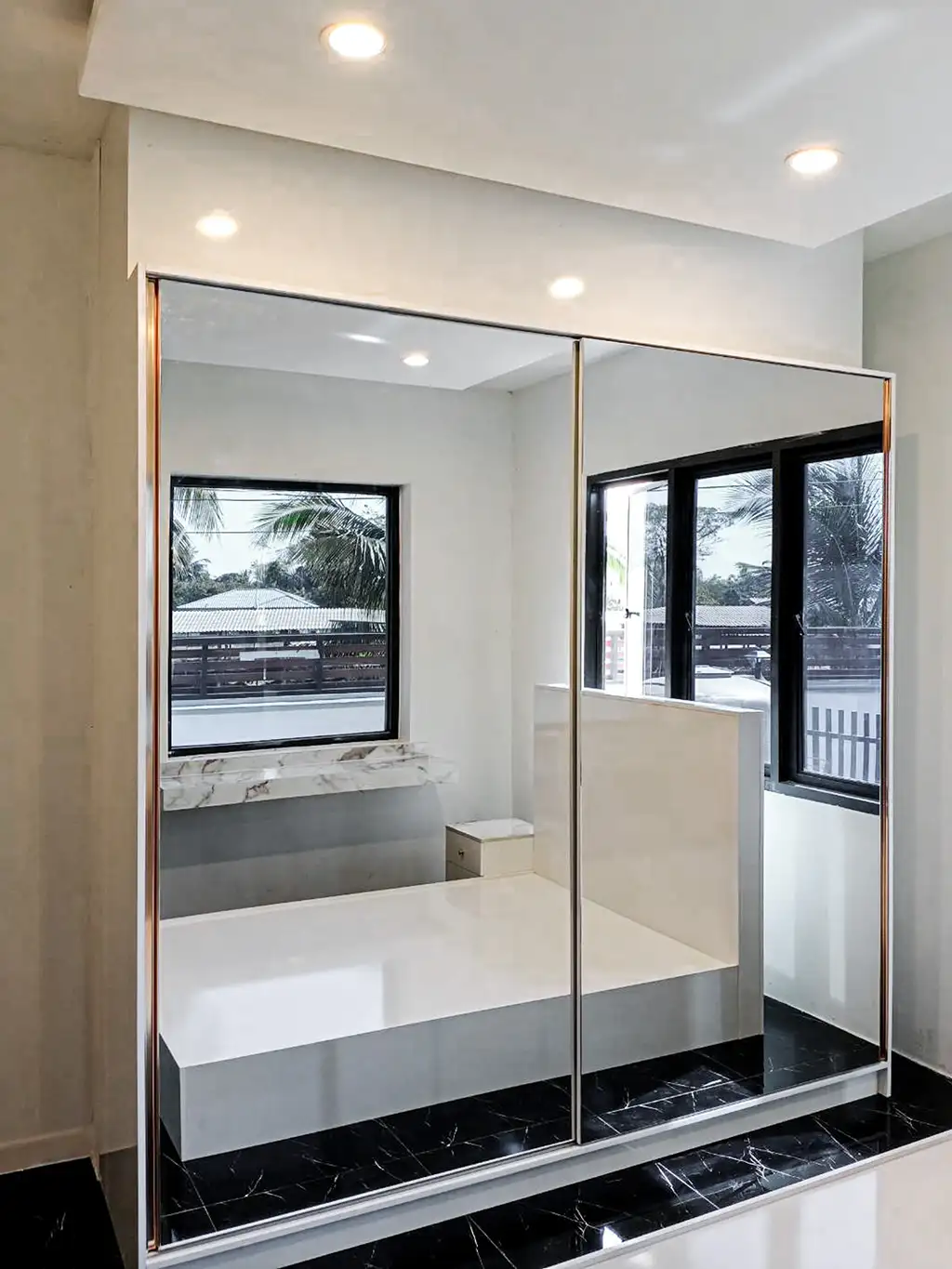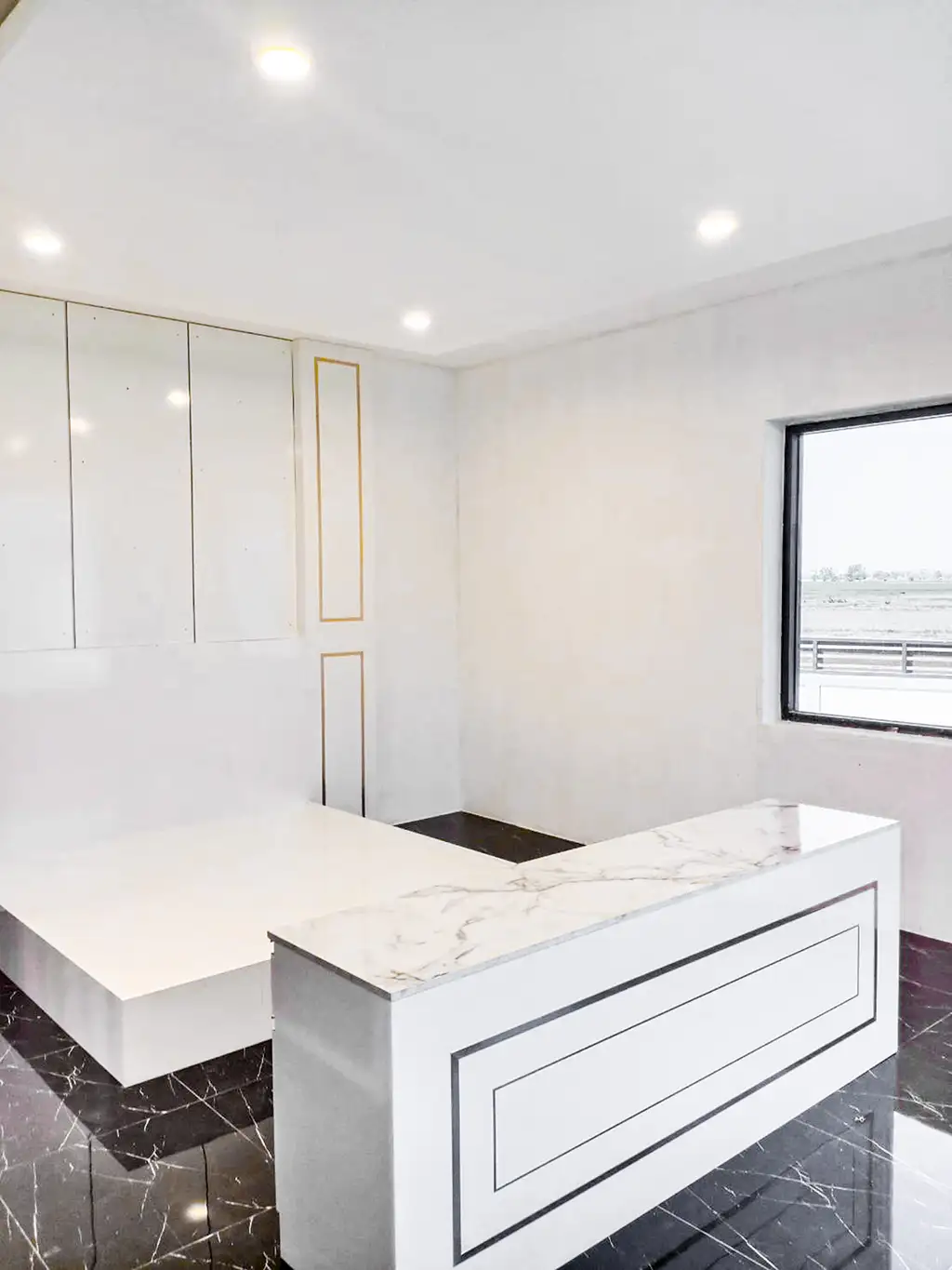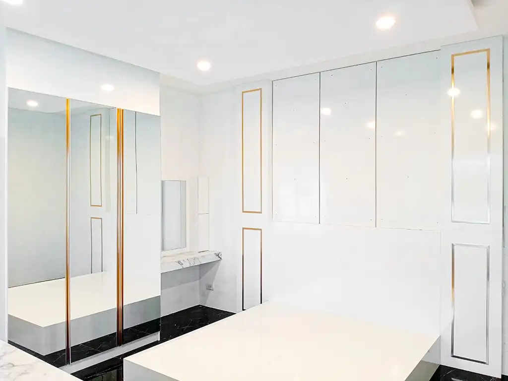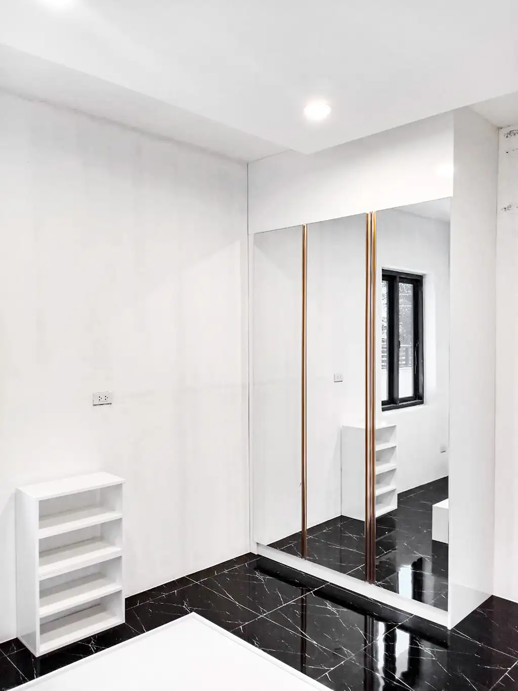 ฐานเตียง Built-in พื้นขาวเรียบ ให้ความรู้สึกโปร่ง สว่าง และขับให้ลวดลายหินอ่อนรอบห้องดูโดดเด่นยิ่งขึ้น กระจกเต็มบานและบานตู้เส้นทองช่วยขยายมิติของห้อง ทำให้ห้องพักดูหรูหราในแบบโมเดิร์นมินิมอลที่ยังคงฟีลอบอุ่นผ่อนคลายอยู่ครบถ้วน