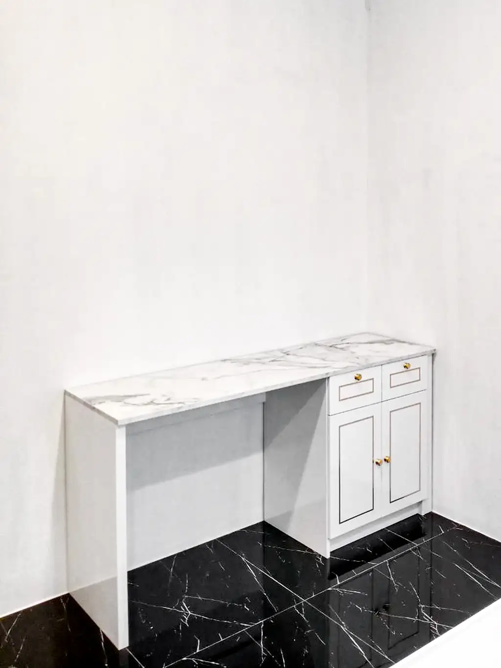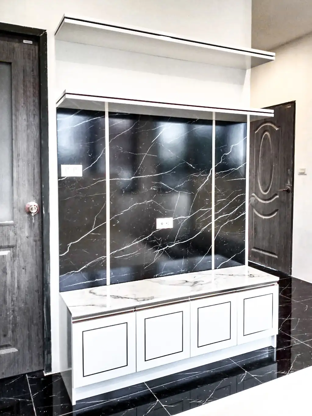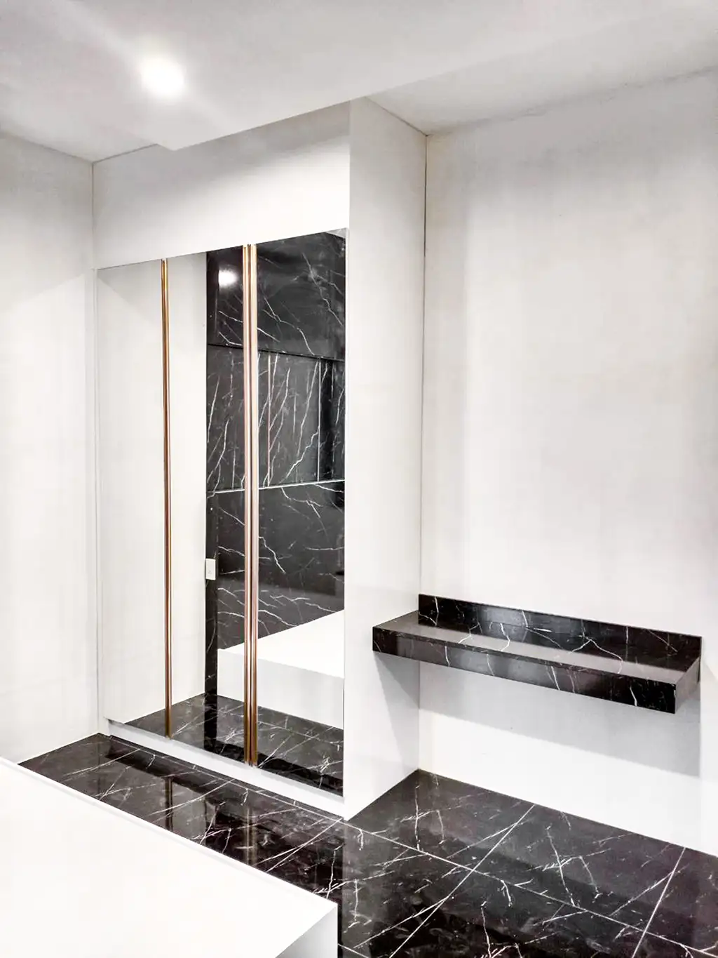 ด้วยการเลือกใช้วัสดุพรีเมียม เช่น หินอ่อนลายดำ ลามิเนตโทนขาวเงา และกรอบเส้นสีทอง ทำให้ทุกมุมของบ้านพักตากอากาศหลังนี้มีทั้ง “ความหรู” และ “ความสบาย” อยู่ในตัวเดียวกัน ช่วยให้ผู้ใช้งานรู้สึกผ่อนคลายแต่ยังคงความพิเศษในทุกครั้งที่เข้ามาพัก ถือเป็นงานออกแบบที่กลมกลืนทั้งภาพรวมและฟังก์ชันในสไตล์เฉพาะของ Mela Deco