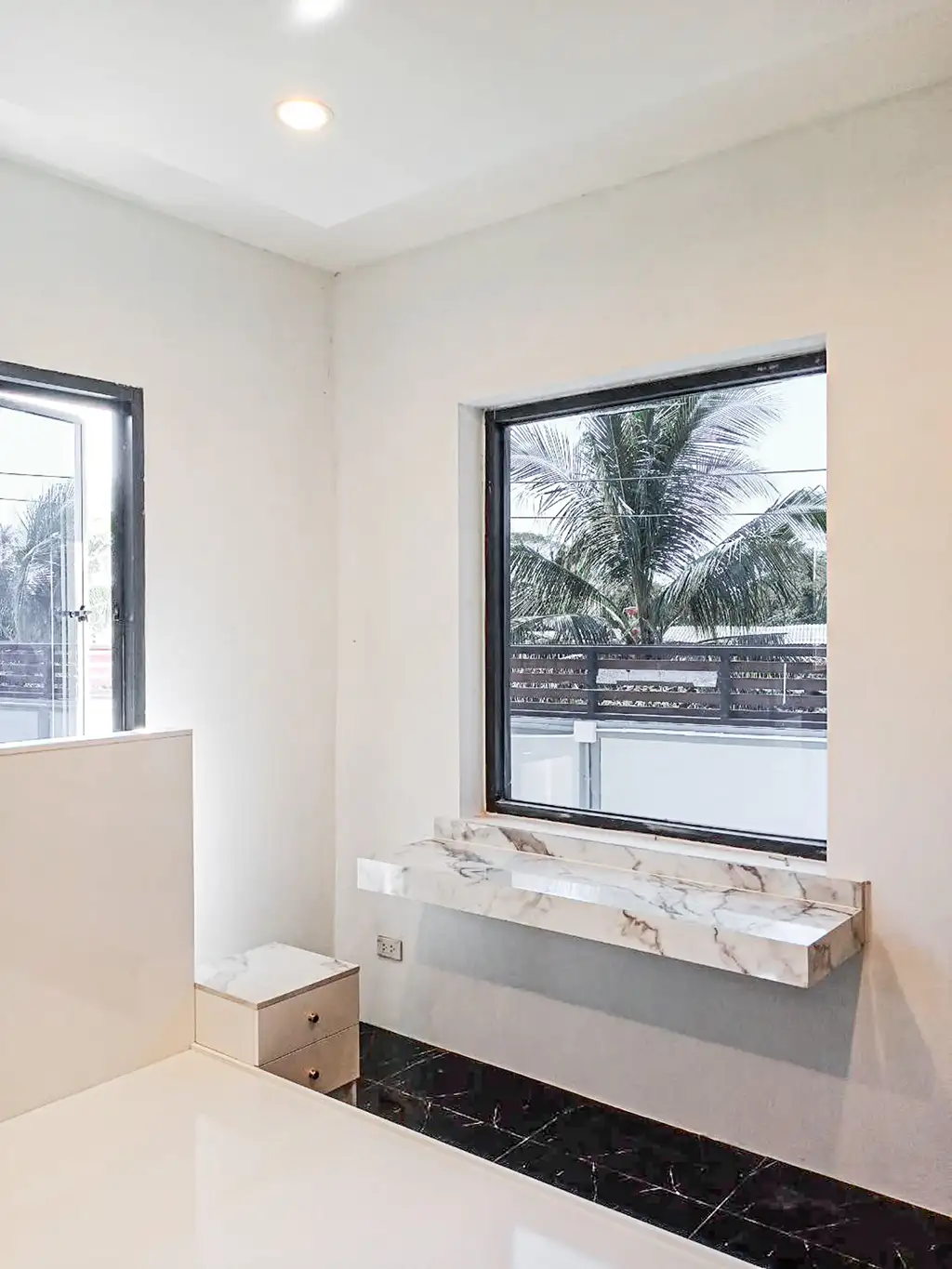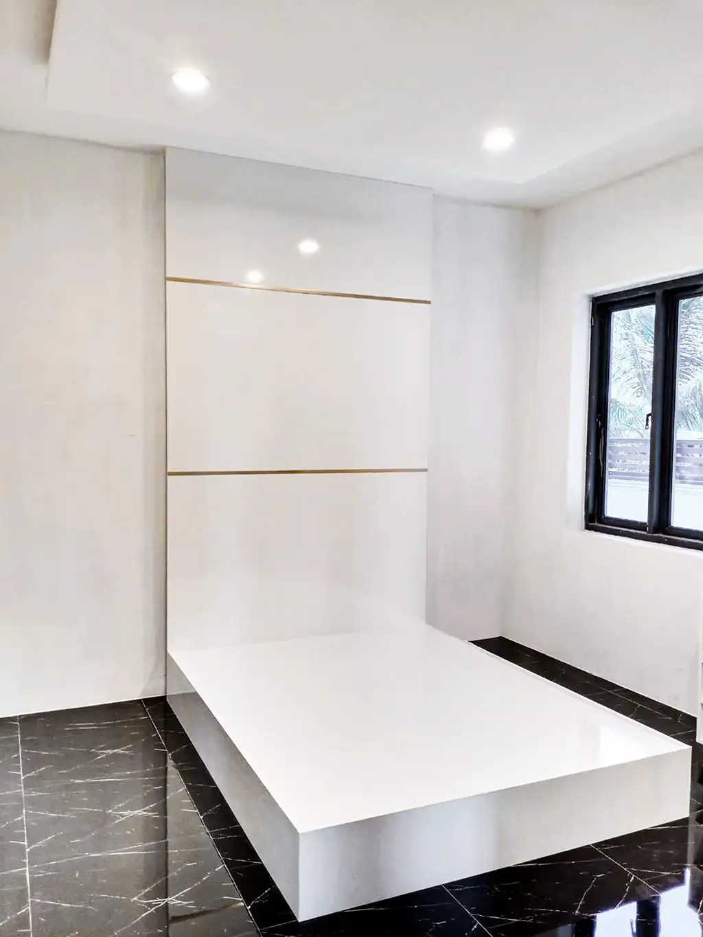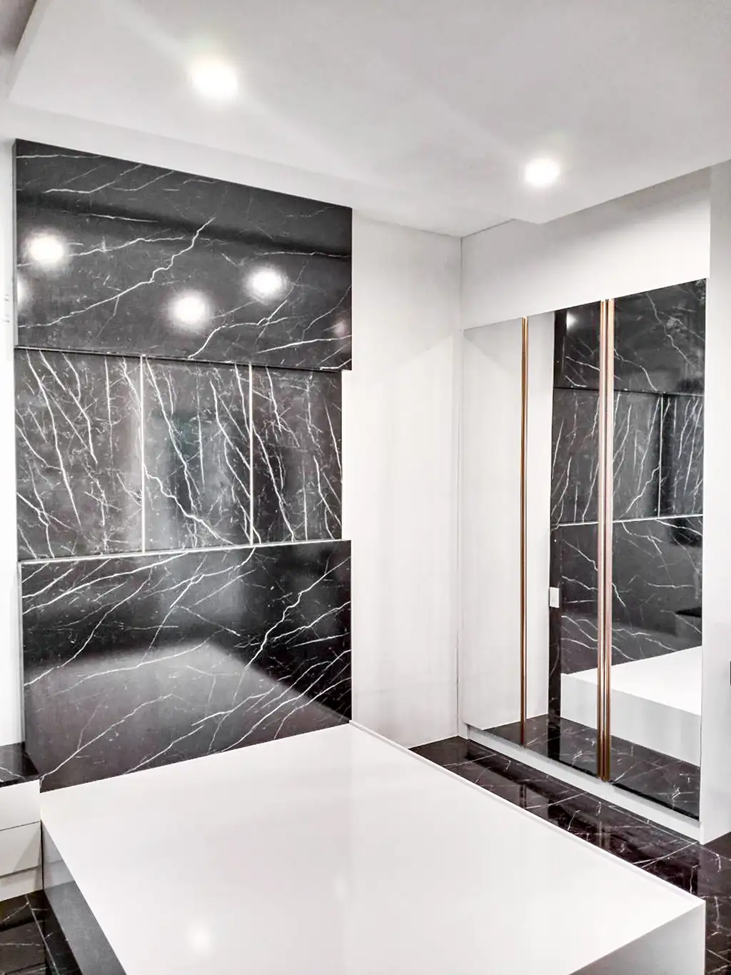 ส่วนของห้องอื่นๆ ภายในบ้านยังคงเอกลักษณ์เดียวกันผ่านการใช้ผนังลายหินอ่อนดำเป็นองค์ประกอบหลัก ผสานกับดีเทลลายไม้และเส้นสายสีทองบางจุด เพื่อเพิ่มความอุ่นและความพรีเมียมในแบบรีสอร์ตสมัยใหม่ ไม่ว่าจะเป็นมุมตู้บิลต์อิน โต๊ะเครื่องแป้ง หรือผนังหัวเตียง ทุกชิ้นถูกออกแบบให้ใช้งานง่ายเป็นสัดส่วน พร้อมซ่อนฟังก์ชันเก็บของไว้อย่างเรียบร้อยเพื่อให้พื้นที่ดูสะอาดตาเสมอ