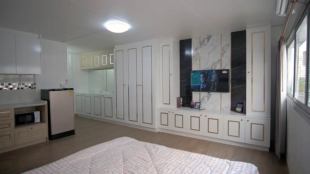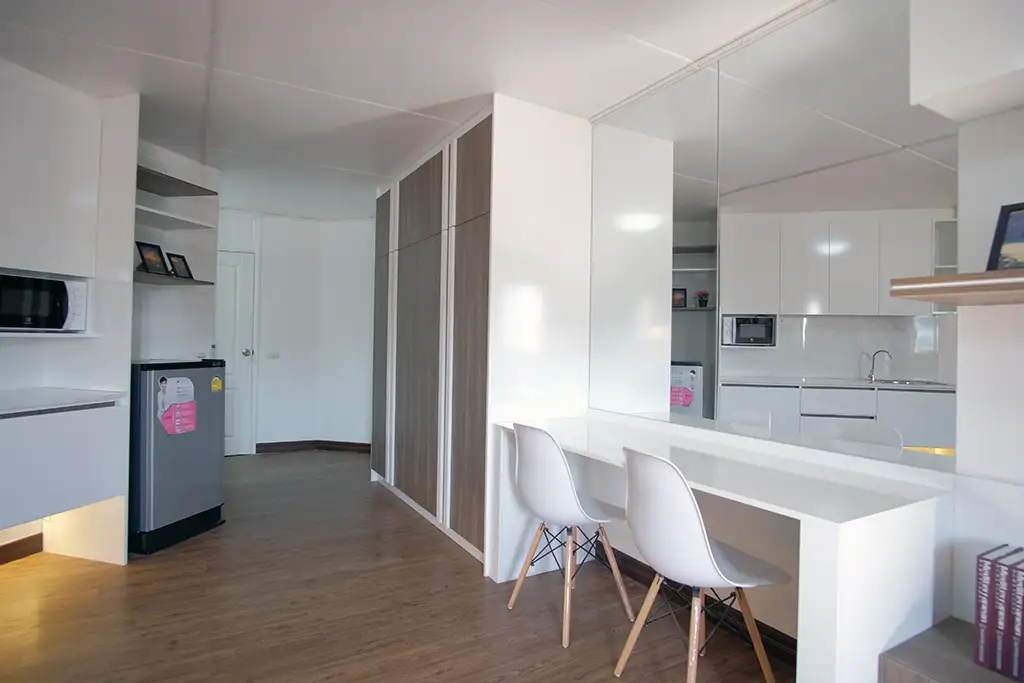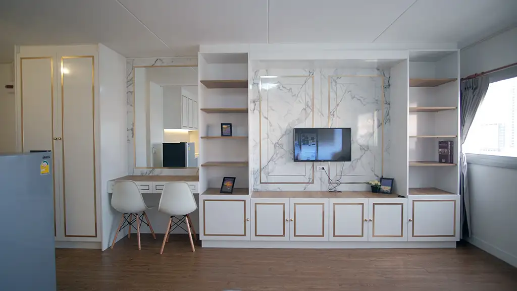 ผลงานรีโนเวทและบิวท์อินห้องพักที่ POPULAR CONDO คอนโดเมืองทองธานี โดย MELA DECO ถูกออกแบบขึ้นเพื่อยกระดับพื้นที่กะทัดรัดให้กลายเป็นห้องที่ทั้ง หรูหรา น่าอยู่ และใช้งานได้จริงทุกมุม ด้วยสไตล์ Modern Luxury ที่สะท้อนความมีรสนิยมอย่างทันสมัย ถึงแม้พื้นที่จะมีขนาดกะทัดรัด แต่ทีมงานออกแบบของเราใช้หลักการจัดสรรพื้นที่อย่างลงตัว ทำให้ทุกโซนสามารถใช้งานได้อย่างเต็มประสิทธิภาพ ไม่ว่าจะเป็นมุมพักผ่อน พื้นที่จัดเก็บ หรือพื้นที่ทำงาน ทุกอย่างถูกคำนวณอย่างละเอียดเพื่อให้คุ้มค่าทุกตารางนิ้ว