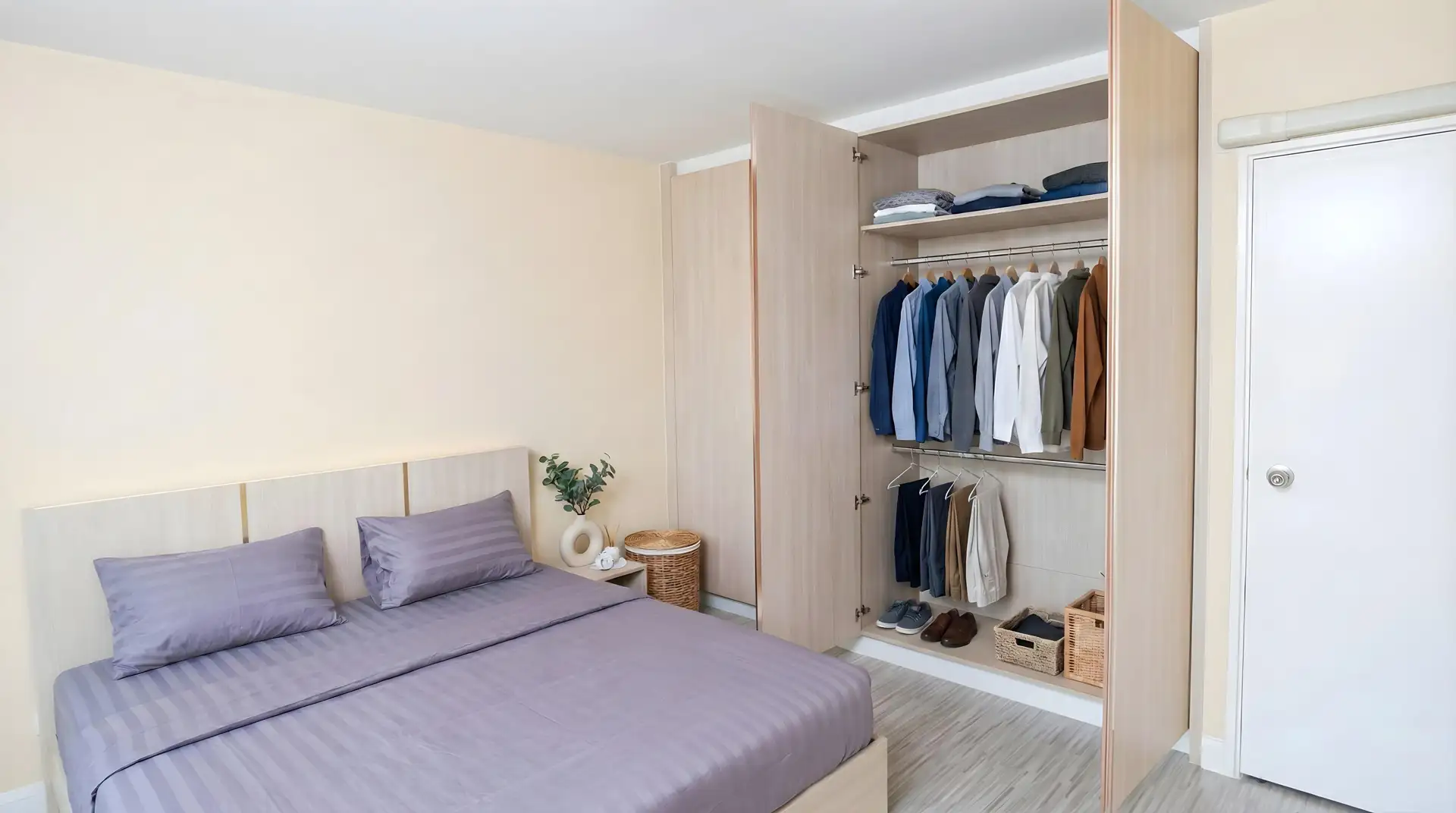 แนวคิดการออกแบบมุ่งสร้างบรรยากาศที่อบอุ่น เรียบหรู และใช้งานได้จริง ผ่านการเลือกใช้วัสดุลายไม้โทนอ่อนเป็นหลัก ช่วยเพิ่มความรู้สึกผ่อนคลายและเป็นธรรมชาติ ขณะเดียวกันมีการ ตัดเส้นขอบด้วยวัสดุสีทอง ในจุดต่าง ๆ ของงานบิ้วท์อิน เพื่อเพิ่มมิติ ความประณีต และความหรูอย่างพอดี ไม่มากเกินไป