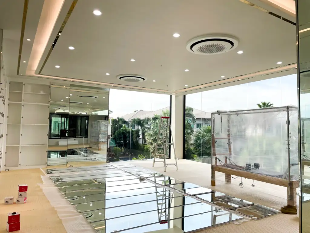 แนวคิดของโครงการนี้มุ่งเน้นความเรียบหรู ทันสมัย และโปร่งโล่ง พื้นที่ภายในถูกออกแบบให้ใช้กระจกเป็นองค์ประกอบหลัก ช่วยเชื่อมต่อมุมมองระหว่างพื้นที่ต่าง ๆ และเปิดรับแสงธรรมชาติได้อย่างเต็มที่ ลดความอึดอัด พร้อมเสริมด้วยชั้นเก็บของและระบบจัดเก็บแบบซ่อนอยู่หลังกระจก ให้ภาพรวมดูสะอาดตา เป็นระเบียบ และตอบโจทย์การใช้งานจริงโดยไม่รบกวนความสวยงามของพื้นที่