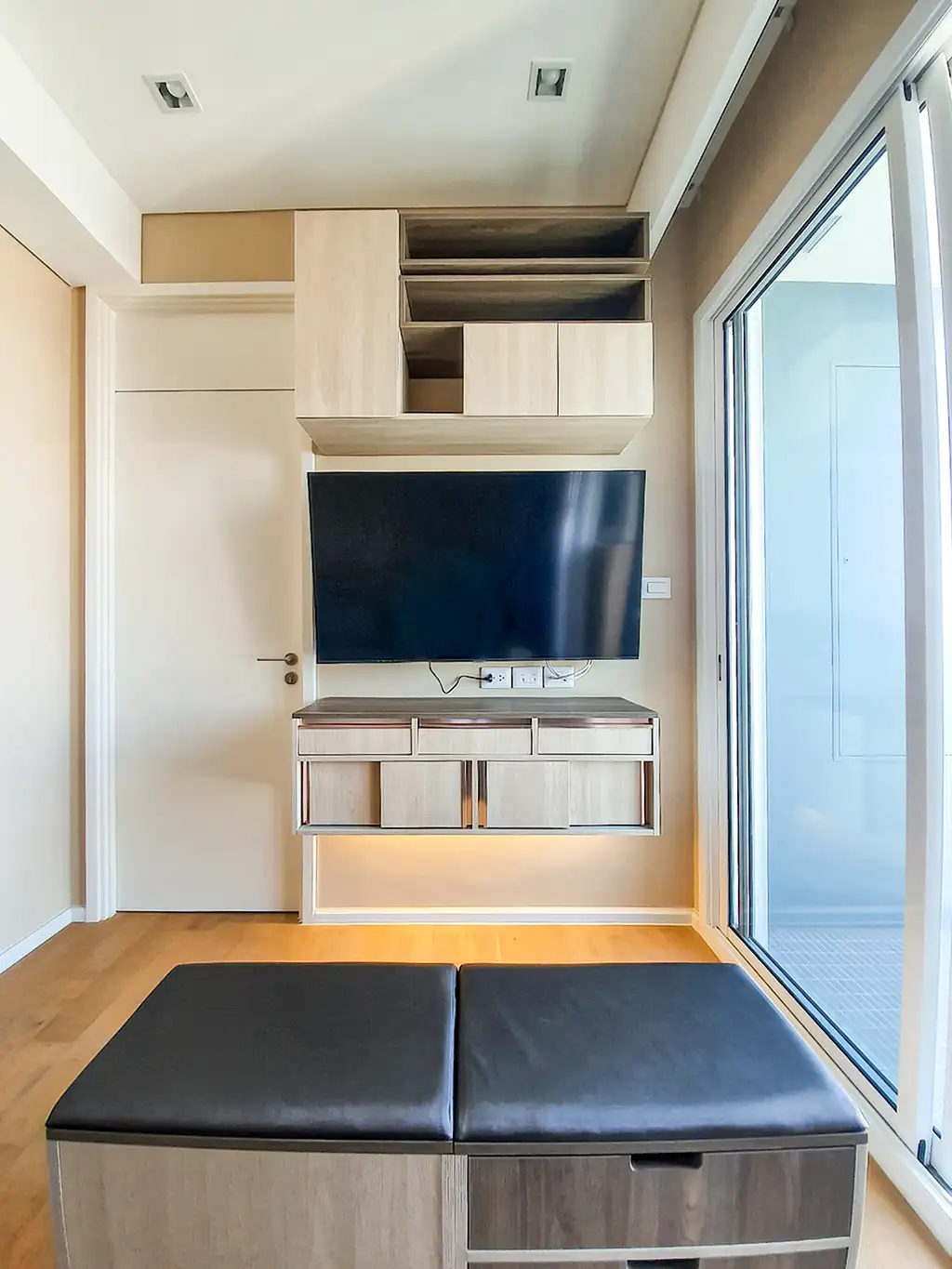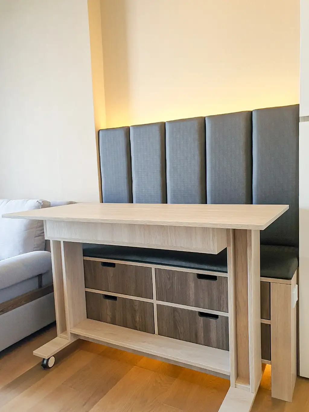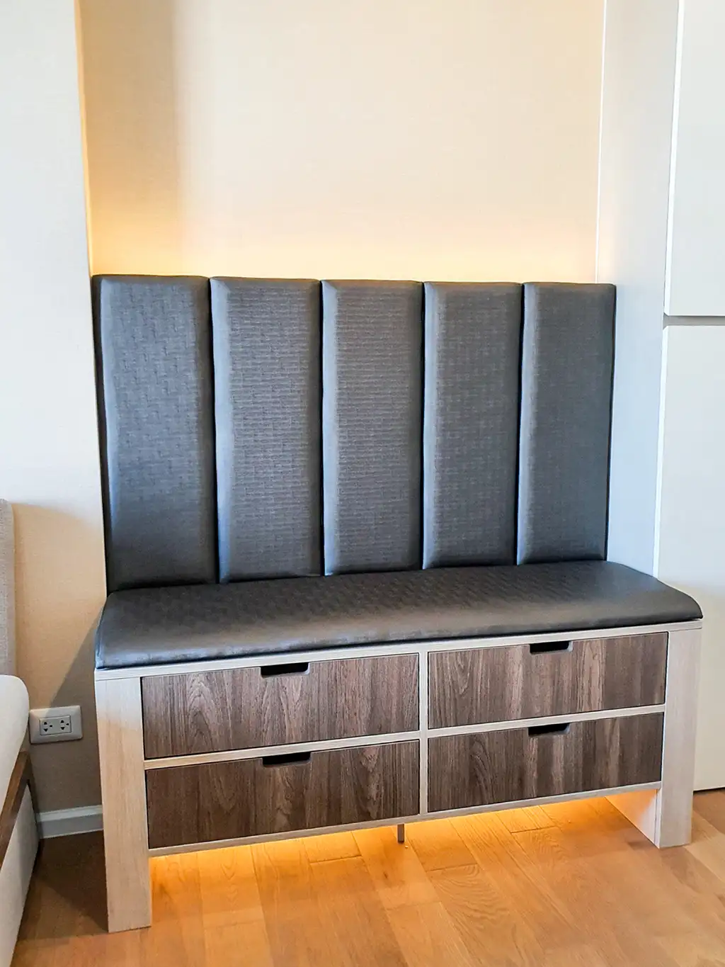 ในมุมพักผ่อน ชุดม้านั่ง Built-in พร้อมพนักพิงสูงบุผ้า ให้ทั้งความสบายและความสวยงามไปพร้อมกัน ส่วนฐานล่างออกแบบเป็นลิ้นชักเก็บของหลากขนาด ช่วยเพิ่มพื้นที่เก็บของในคอนโดได้อย่างคุ้มค่า ไฟซ่อนใต้ฐานช่วยเพิ่มความอบอุ่นและบรรยากาศที่นุ่มนวลยิ่งขึ้น
