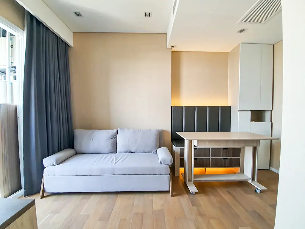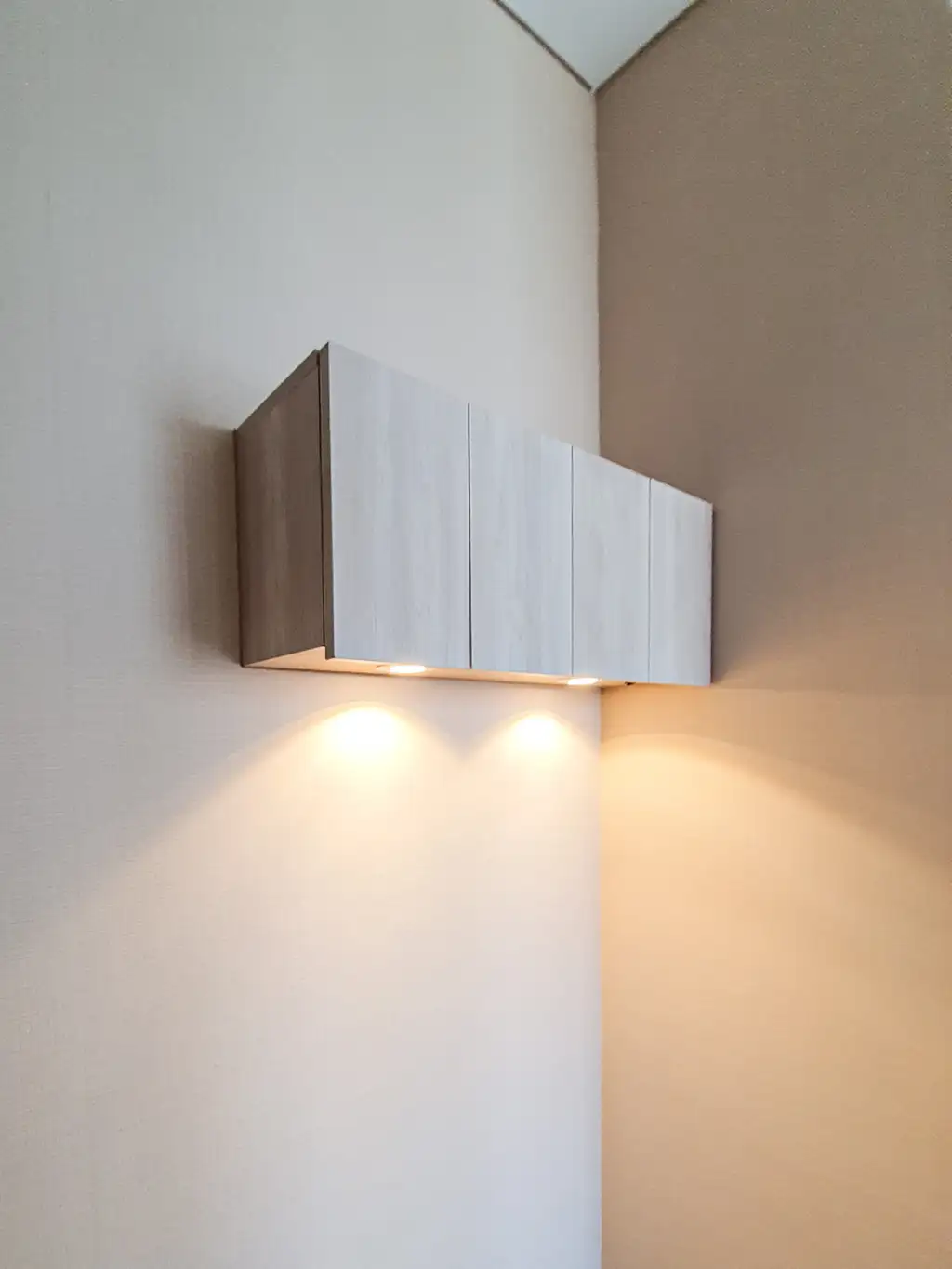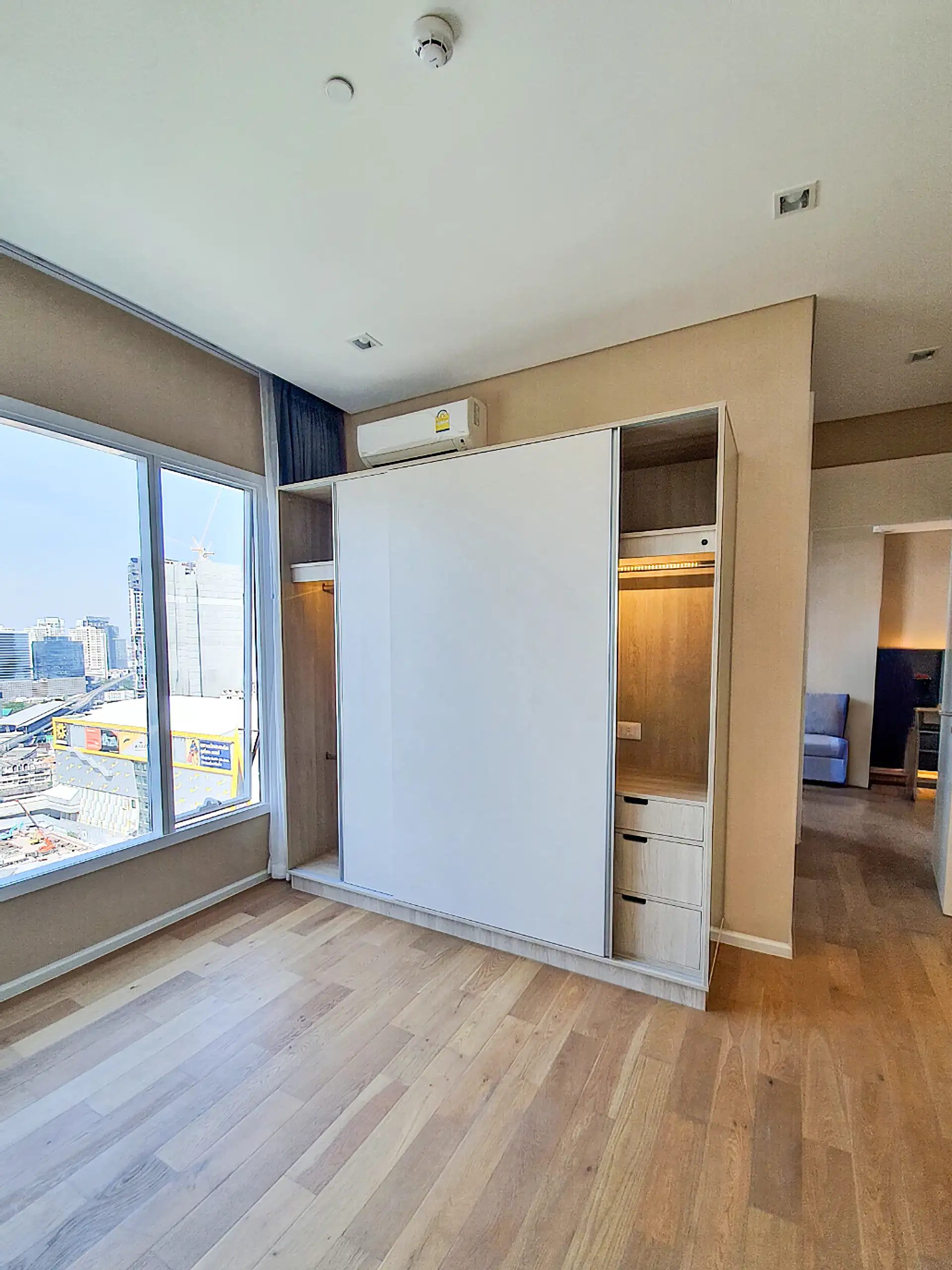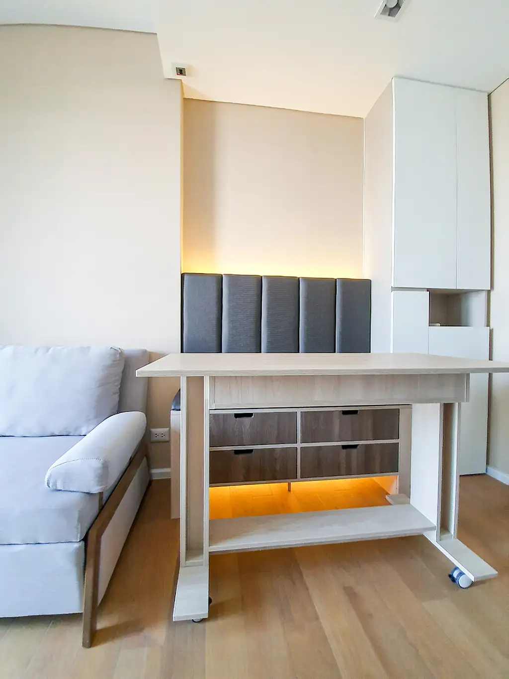 ในมุมพักผ่อน ชุดม้านั่ง Built-in พร้อมพนักพิงสูงบุผ้า ให้ทั้งความสบายและความสวยงามไปพร้อมกัน ส่วนฐานล่างออกแบบเป็นลิ้นชักเก็บของหลากขนาด ช่วยเพิ่มพื้นที่เก็บของในคอนโดได้อย่างคุ้มค่า ไฟซ่อนใต้ฐานช่วยเพิ่มความอบอุ่นและบรรยากาศที่นุ่มนวลยิ่งขึ้น
