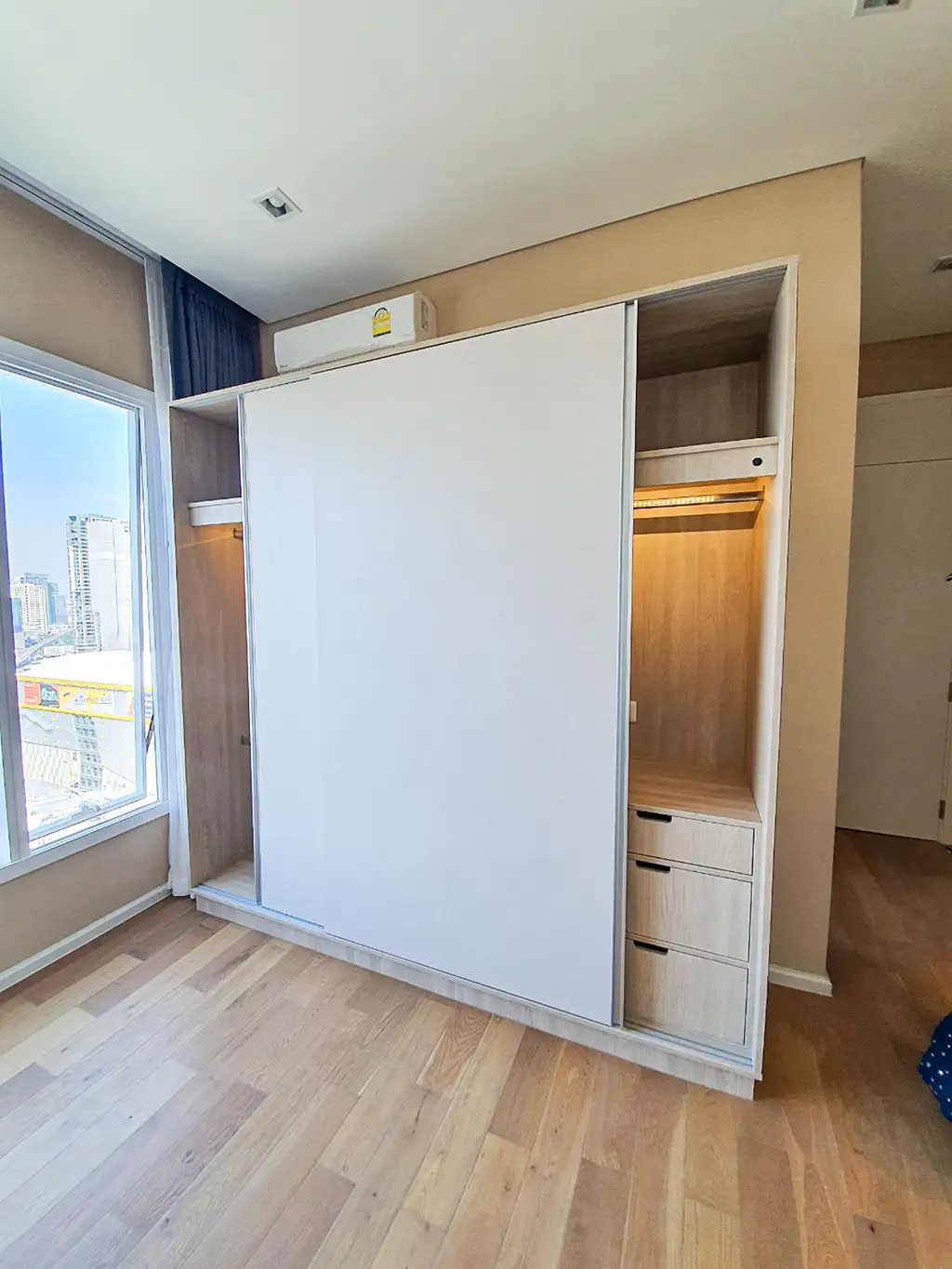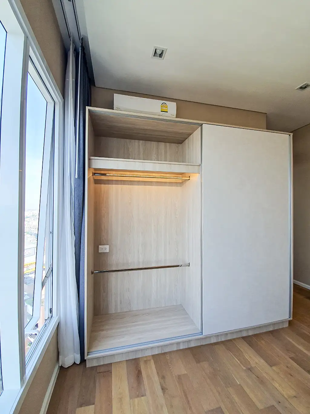 ตู้เสื้อผ้าบานเลื่อนขนาดใหญ่ถูกออกแบบให้ใช้งานง่าย และช่วยประหยัดพื้นที่ในห้อง รางเลื่อนซ่อนให้ความรู้สึกเรียบเนียน ขณะที่ไฟซ่อนโทนอุ่นภายในตู้ช่วยให้การเลือกเสื้อผ้าสะดวกขึ้น พร้อมเสริมความพรีเมียมในรายละเอียดแบบเงียบๆ ช่องเก็บของหลายรูปแบบ ทั้งราวแขวน ลิ้นชัก และพื้นที่โล่ง ช่วยจัดระเบียบของใช้ได้อย่างมีระบบ