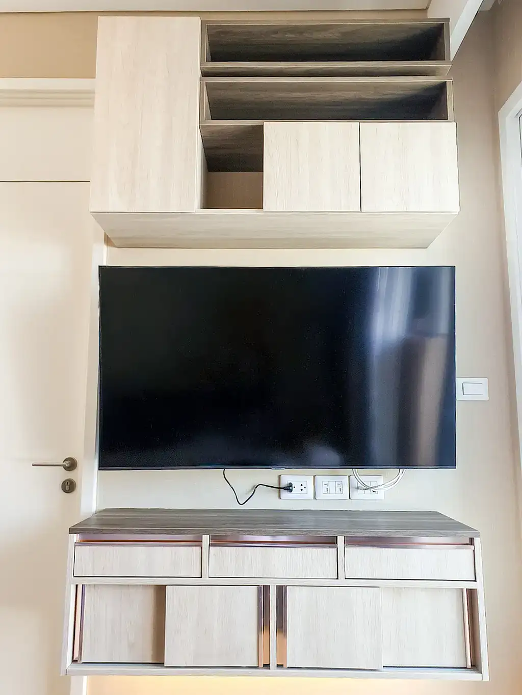 ชุดชั้นวางทีวีและตู้ลอยผนังถูกจัดวางให้ใช้งานง่ายและเป็นสัดส่วน โทนลายไม้ที่เลือกใช้ทั้งด้านบนและด้านล่างช่วยให้ภาพรวมกลมกลืนกับพื้นที่โดยไม่รู้สึกอึดอัด ช่องเปิดและช่องปิดผสมกัน ช่วยให้จัดเก็บและตกแต่งได้ตามความต้องการของผู้อาศัย