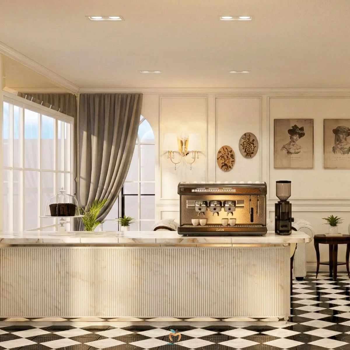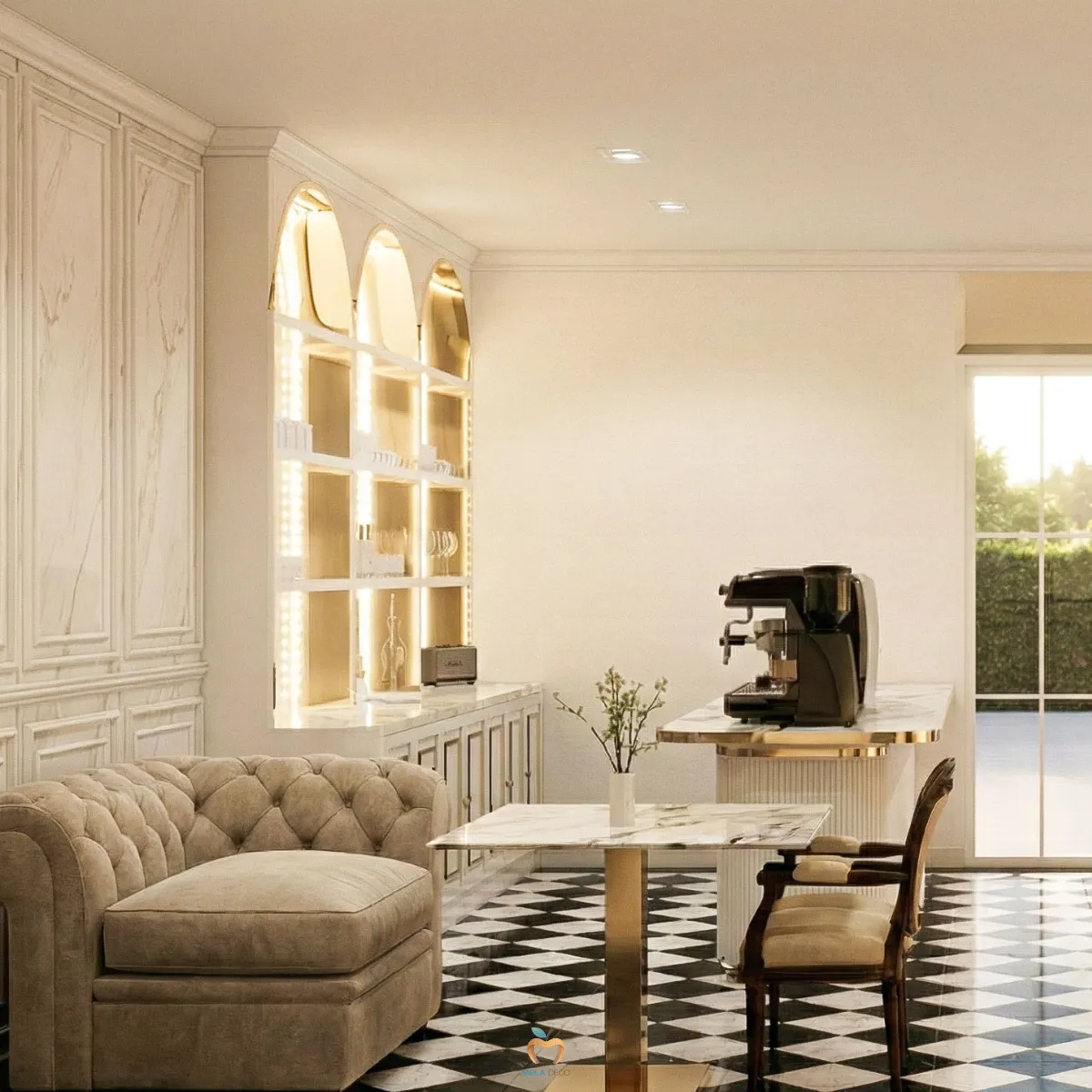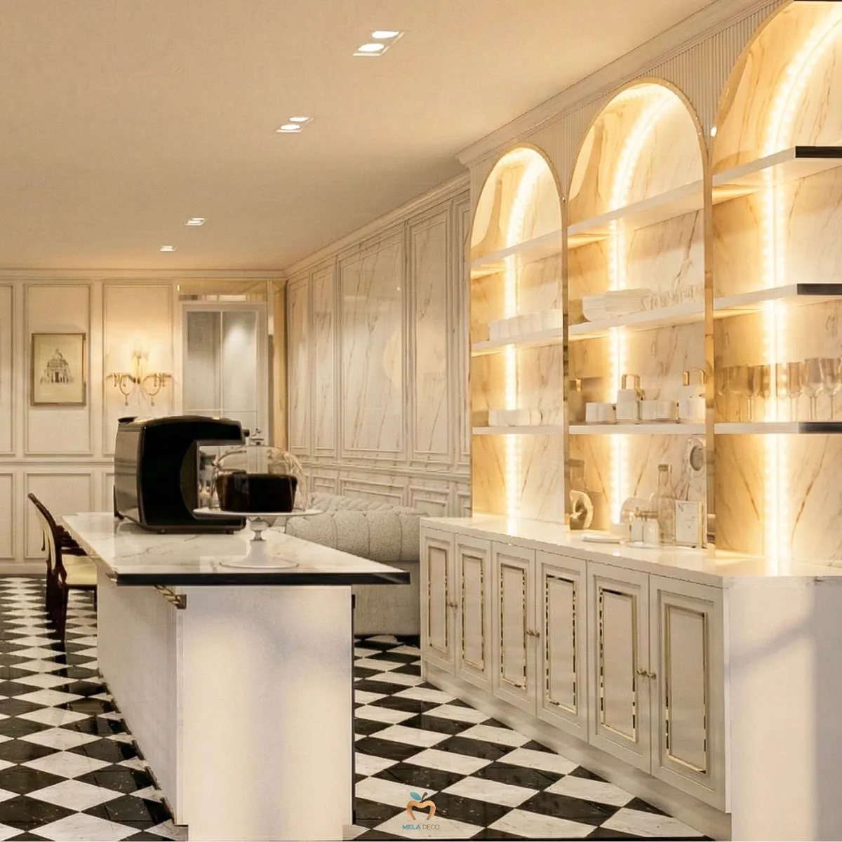 เคาน์เตอร์บิ้วอินที่กลายเป็น Icon ของร้าน หนึ่งในจุดเด่นที่สุดจากภาพคือ เคาน์เตอร์บาร์บิ้วอินที่ออกแบบฉากหลังเป็น Triple Golden Arches หรือซุ้มโค้งสามช่อง โครงสร้างซุ้มโค้งนี้ได้รับแรงบันดาลใจจากสถาปัตยกรรมคลาสสิกของฝรั่งเศส ให้ความรู้สึกอ่อนช้อย สง่างาม และทรงพลังในเวลาเดียวกัน วัสดุหลักคือ หินอ่อนสีขาวลายเทาที่ให้ความเย็น ฉ่ำและหรูหรา เสริมด้วยไฟซ่อนภายในซุ้มทำให้ชั้นวางแก้วและอุปกรณ์บาร์ดูเปล่งประกายราวกับตู้โชว์เครื่องประดับ ในเชิงการใช้งานเคาน์เตอร์บิ้วอินนี้ถูกออกแบบให้บาริสต้าทำงานได้อย่างลื่นไหล ขณะเดียวกันก็ทำหน้าที่เป็นเวทีให้ลูกค้าได้มองเห็นกระบวนการชงกาแฟอย่างเพลิดเพลิน