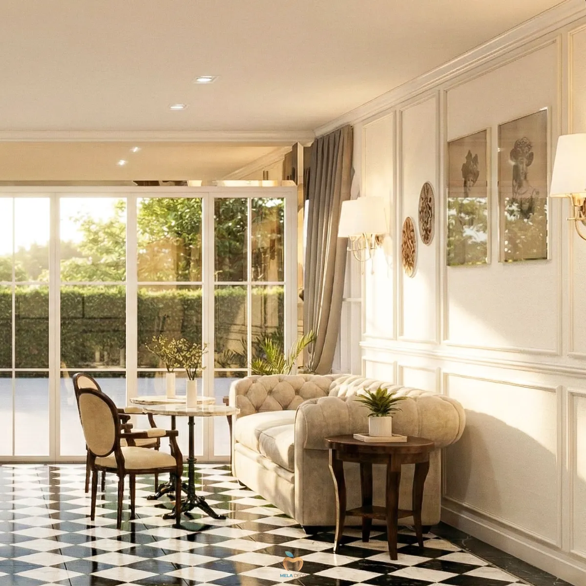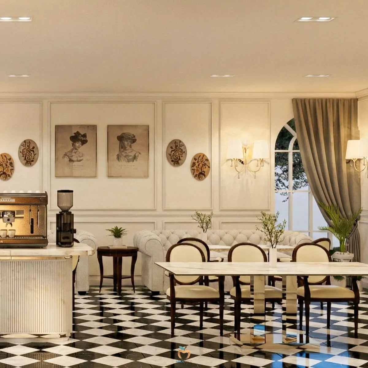 บิ้วอินผนังคิ้วบัวโครงสร้างความหรูหราที่ไร้กาลเวลาจากภาพจะเห็นได้ชัดว่า ผนังรอบร้านถูกบิ้วอินด้วย Classic White Wainscoting เดินเส้นคิ้วบัวอย่างประณีตในสัดส่วนที่สมมาตรตลอดทั้งพื้นที่ การออกแบบลักษณะนี้ช่วยยกระดับ Space ให้ดูโอ่อ่าราวกับอยู่ในคฤหาสน์ยุโรป มากกว่าคาเฟ่ทั่วไป คิ้วบัวถูกจัดให้สอดคล้องกับความสูงของผนังและตำแหน่งเฟอร์นิเจอร์ ทำให้ร้านดูเป็นระเบียบ เรียบร้อยทางสายตา อีกทั้งยังเสริมด้วย Wall Sconces หมวกโคมผ้าจีบ ที่ให้แสง Warm Light นวลตา แสงไฟสะท้อนบนผิวผนังสีขาวช่วยเพิ่มมิติและความโรแมนติกแบบ Parisian Chic อย่างแท้จริง งานบิ้วอินผนังลักษณะนี้ ไม่เพียงสร้างความสวยงาม แต่ยังเป็นฉากหลังที่สมบูรณ์แบบสำหรับการถ่ายภาพ ถือเป็นหัวใจสำคัญของคาเฟ่ในยุคปัจจุบันเลยค่ะ