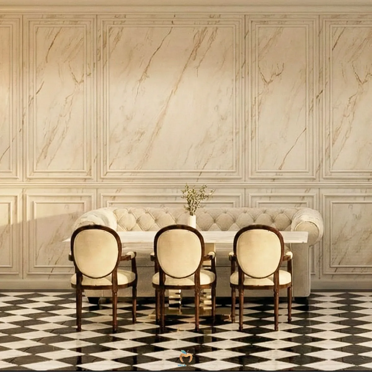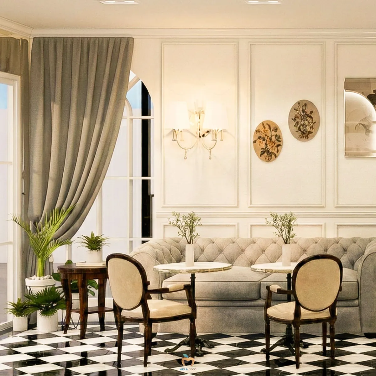 พื้นบิ้วอินลายหมากรุก ที่เป็นลายเซ็นของ Parisian Cafe พื้นกระเบื้อง Black & White Checkerboard คือองค์ประกอบที่ช่วยล็อกคาแรกเตอร์ของร้านตั้งแต่ก้าวแรก ลายหมากรุกขาว-ดำจากภาพ ทำหน้าที่เป็นฉากฐานที่ขับให้ผนังสีขาว เฟอร์นิเจอร์กำมะหยี่ และหินอ่อนดูโดดเด่นขึ้นทันที นอกจากความสวยงาม พื้นลักษณะนี้ยังช่วยกำหนดทิศทางสายตา ทำให้พื้นที่ยาวดูกว้าง โปร่ง และมีมิติเป็น Signature Look ที่เพียงแค่มอง ก็รู้ทันทีว่านี่คือ Parisian Cafe โดยไม่ต้องมีคำอธิบายใด ๆ เพิ่มเติม