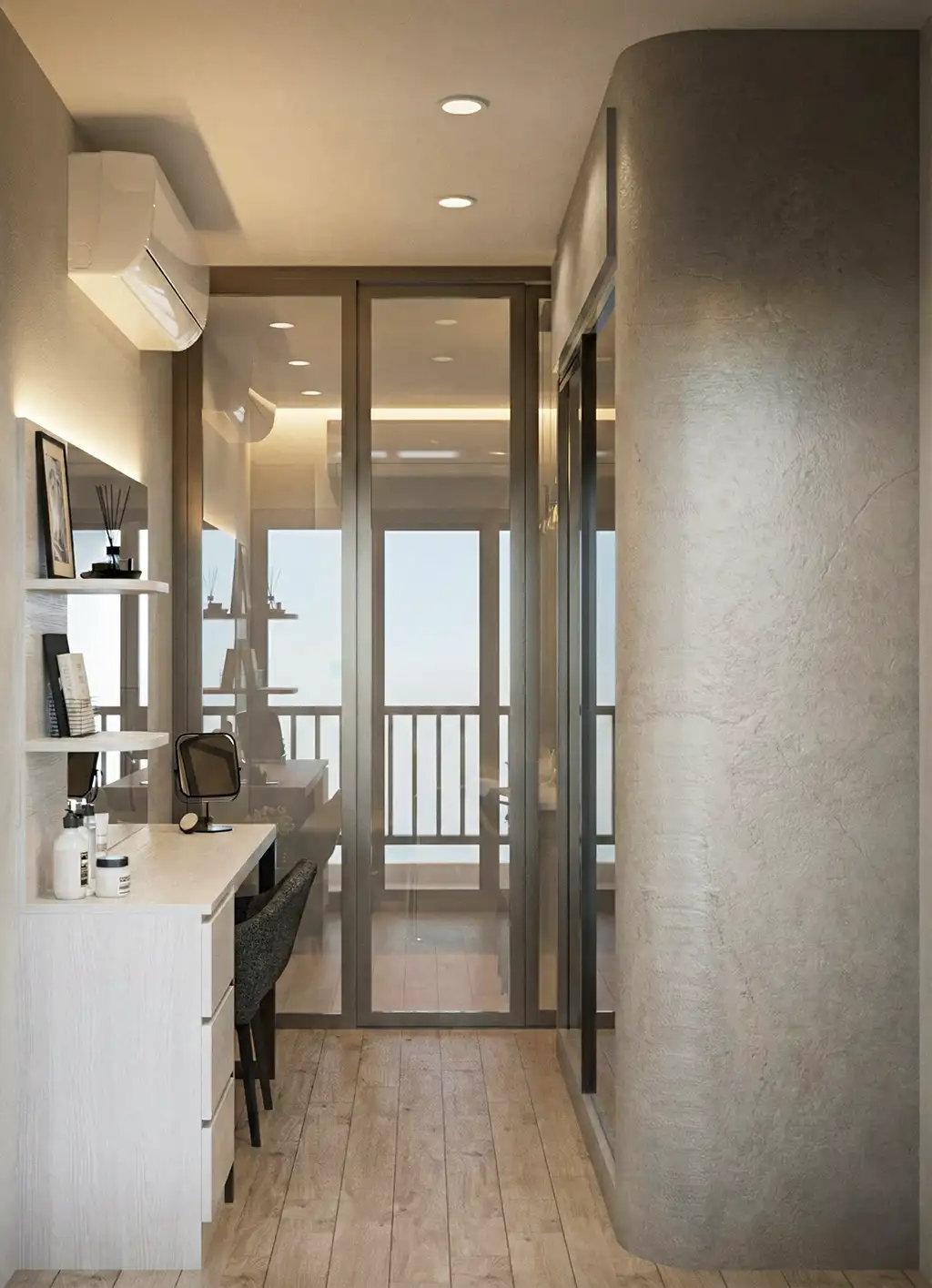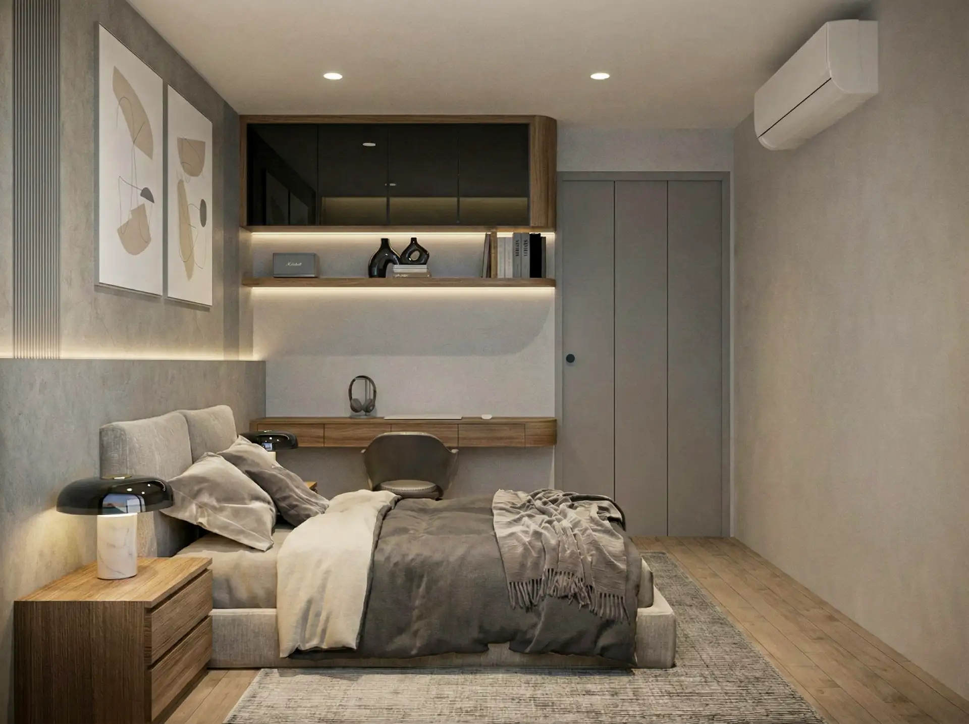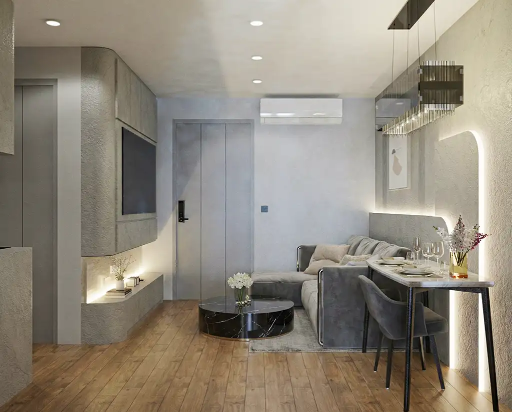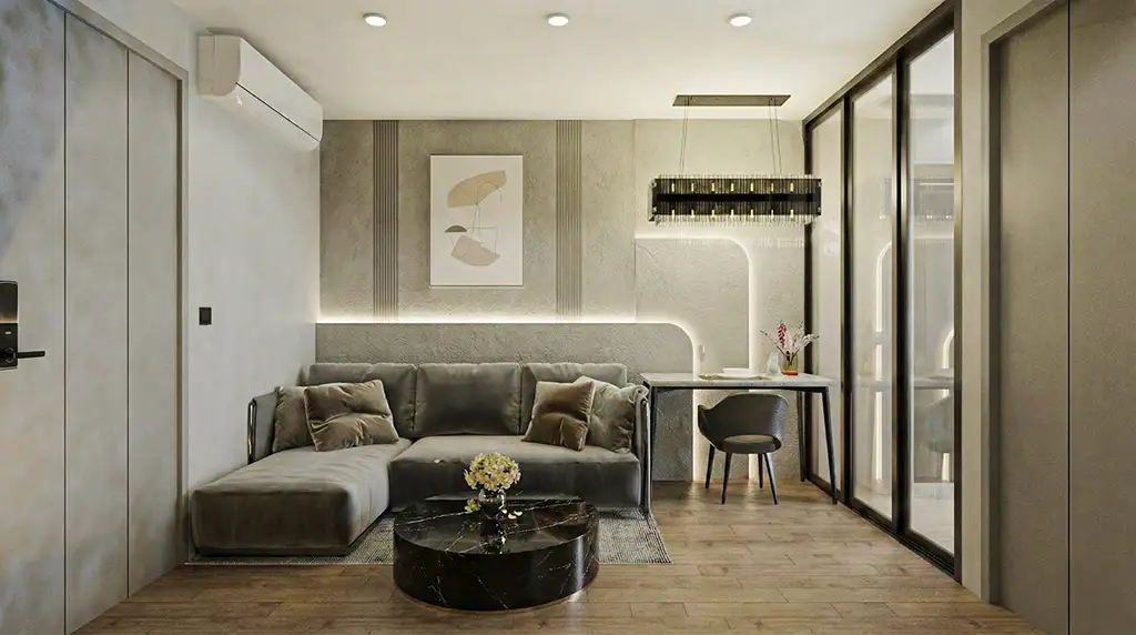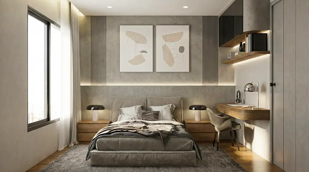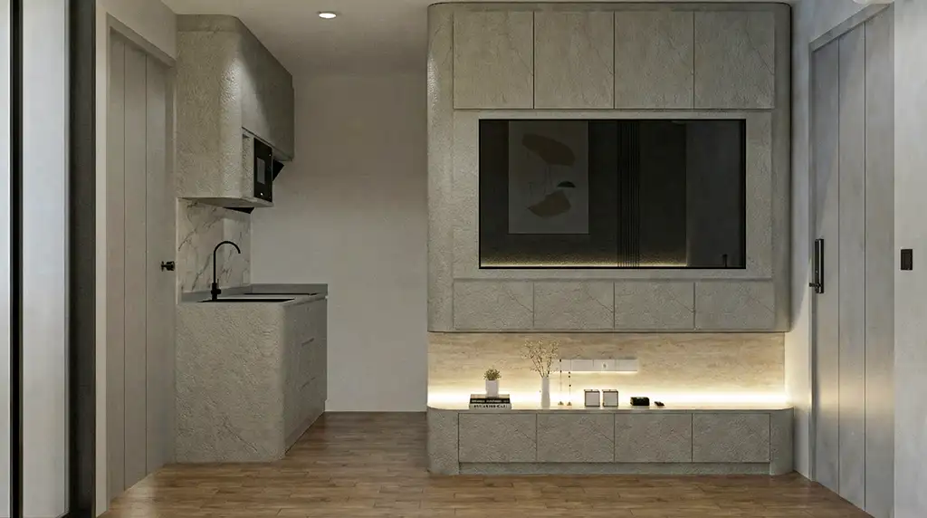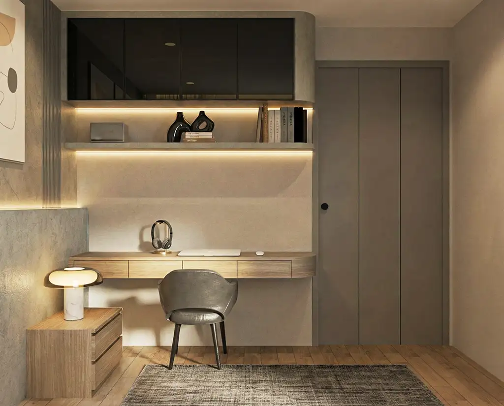 จุดเด่นสำคัญคือการใช้ “เส้นโค้งมน” (Bullnose Edges) ตามมุมตู้ เฟอร์นิเจอร์ และผนังตกแต่ง ที่เข้ามาลดทอนความเหลี่ยมคมของห้องสี่เหลี่ยม ให้ความรู้สึกไหลลื่นและปลอดภัย แสงไฟ LED แบบซ่อนฝ้า (Hidden Ambient Light) ทำหน้าที่เหมือนแสงอาทิตย์รำไรที่ทะลุผ่านม่านหมอก สร้างมิติให้ผนังดูมีตื้นลึกและอบอุ่นขึ้นทันทีที่สัมผัส
