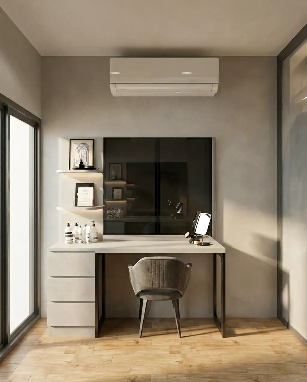 ภาพรวมถูกคุมโทนด้วยสีเทาหลายเฉด (Layered Greys) ตั้งแต่เทาหมอกจางๆ ไปจนถึงเทาเข้มของหินธรรมชาติ ให้ความรู้สึกเหมือนมองเมืองผ่านหน้าต่างในวันที่ฝนปรอย ผสานกับวัสดุกระจกสีเข้ม (Tinted Glass) ที่สะท้อนแสงไฟระยิบระยับคล้ายแสงเมืองยามค่ำคืน